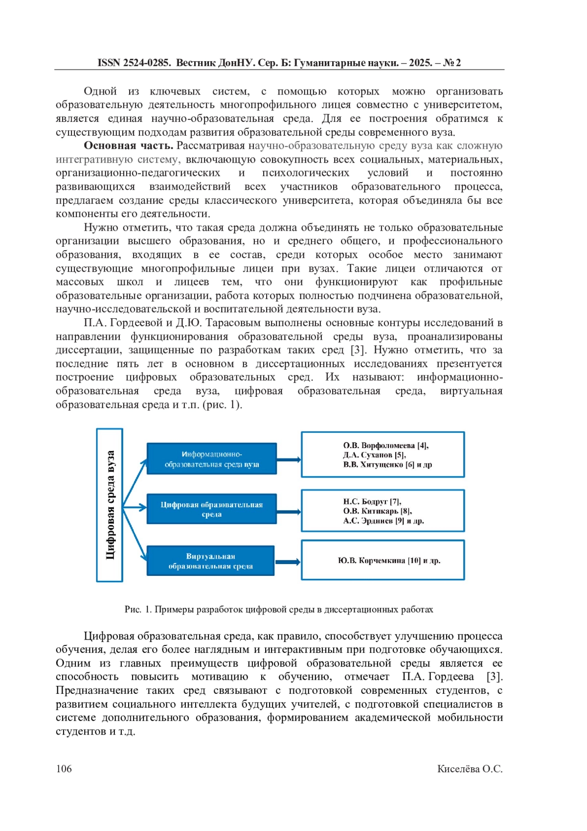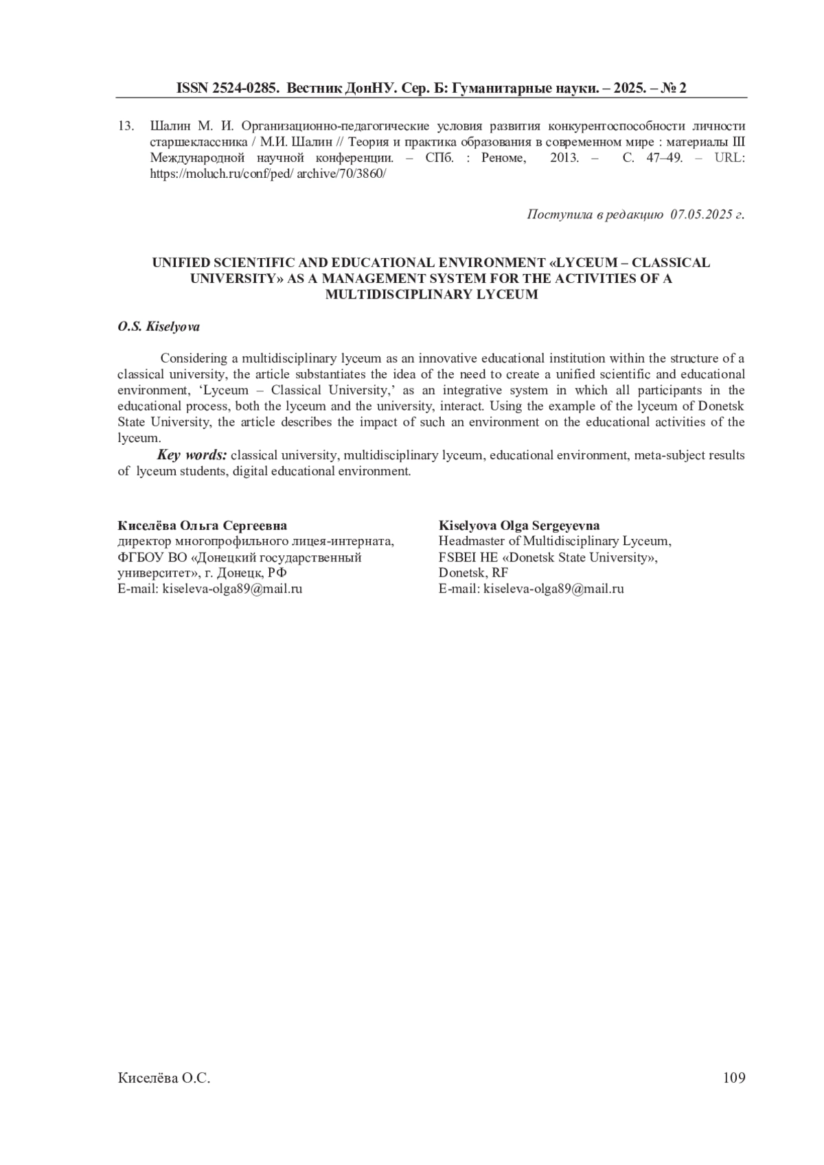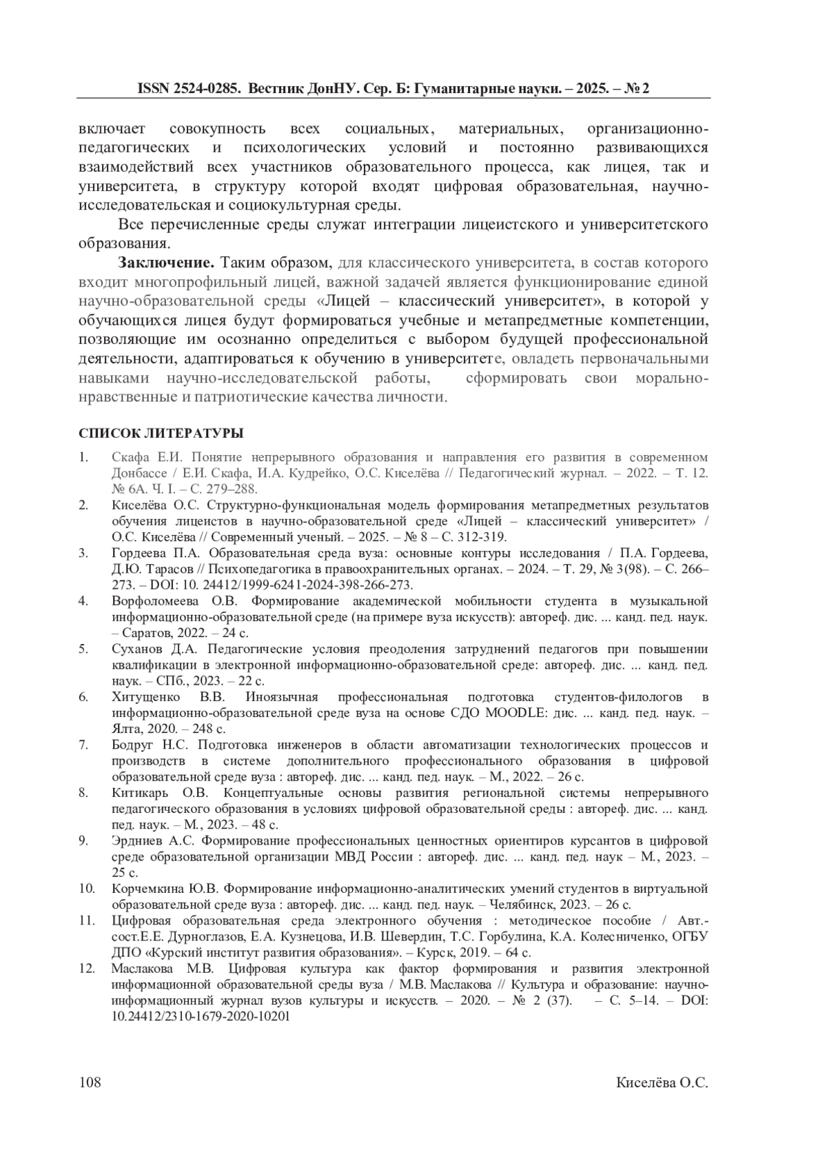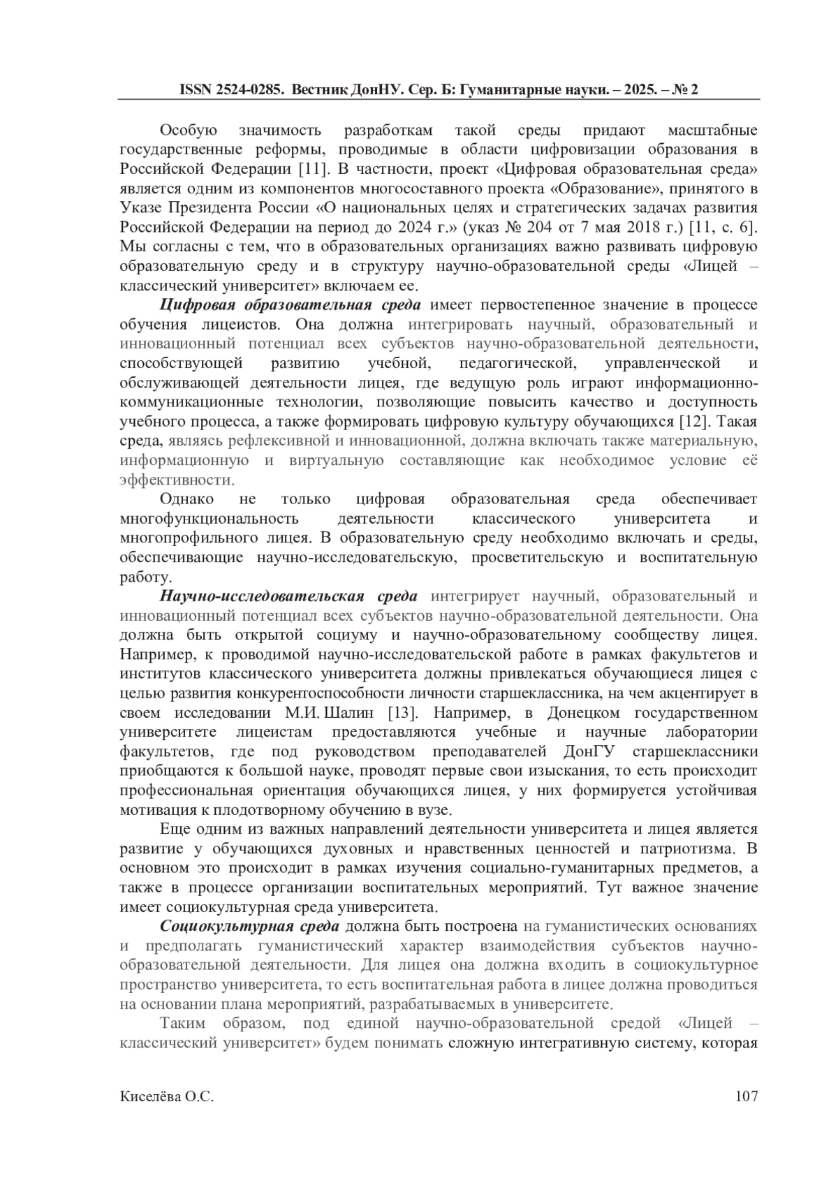 2. Киселёва О.С. Структурно-функциональная модель формирования метапредметных результатов обучения лицеистов в научно-образовательной среде “Лицей - классический университет” / О.С. Киселёва // Современный ученый. - 2025. - № 8 - С. 312-319. EDN: NGGGTJ