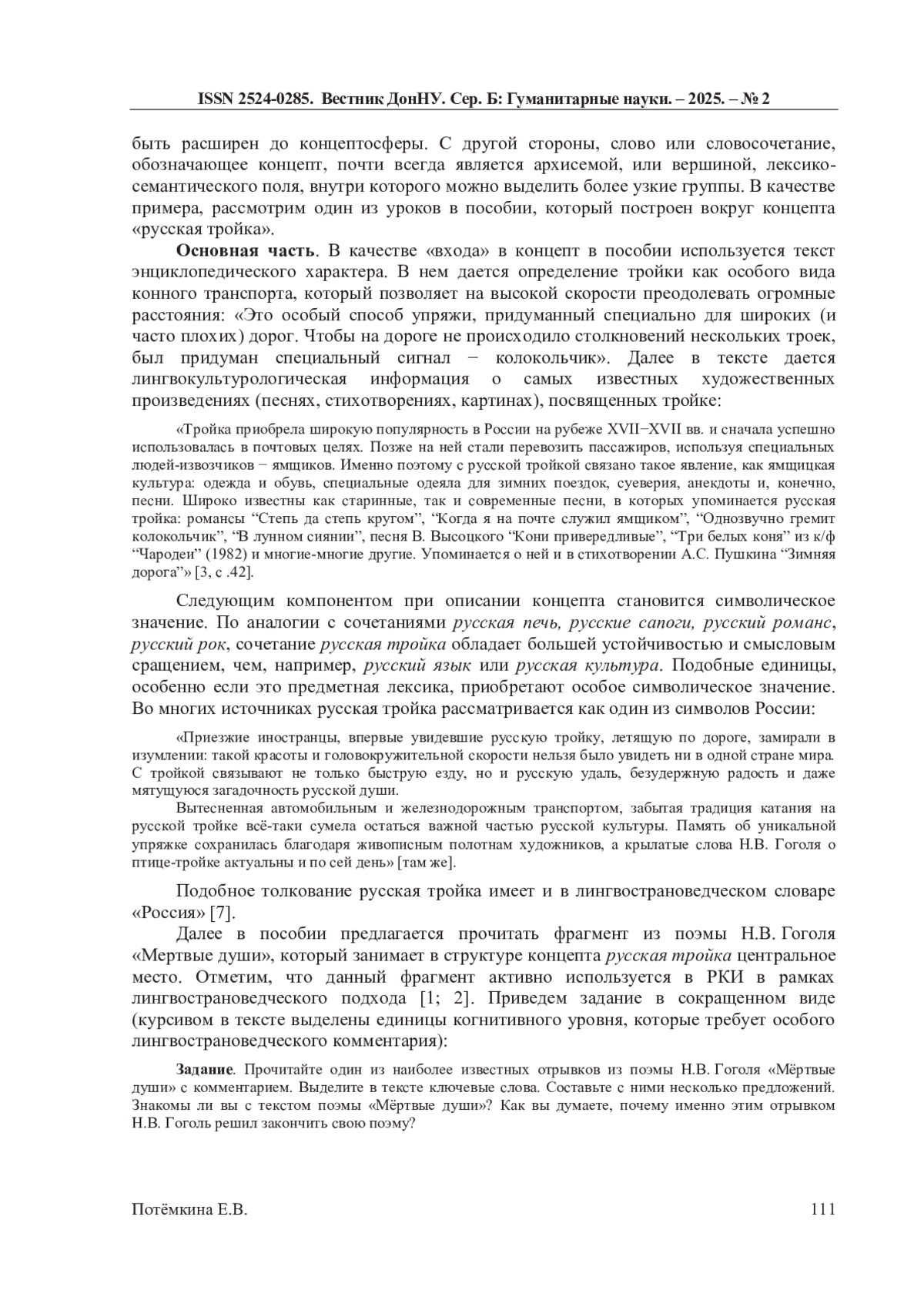 Статья посвящена вопросу о применении в практике преподавания русского языка как иностранного принципов когнитивной лингвистики. На материале текстов песен, обладающих высокой степенью прецедентности в русской лингвокультуре, предлагаются задания, направленные на систематизацию единиц когнитивного уровня языковой личности иностранного учащегося, среди которых центральное место занимает концепт. Концепт выступает в исследовании как структурообразующая единица, позволяющая включить в процесс обучения другие типы когнем и прагмем: ассоциативную цепочку, символ, отсылку к прецедентному тексту и др. Объектом анализа выступает концепт «русская тройка». В процессе описания структуры концепта выявляется его символическая составляющая, связанная с дихотомией жизнь - смерть. На примере песен различных жанров эксплицируется «метафизика» русской тройки.