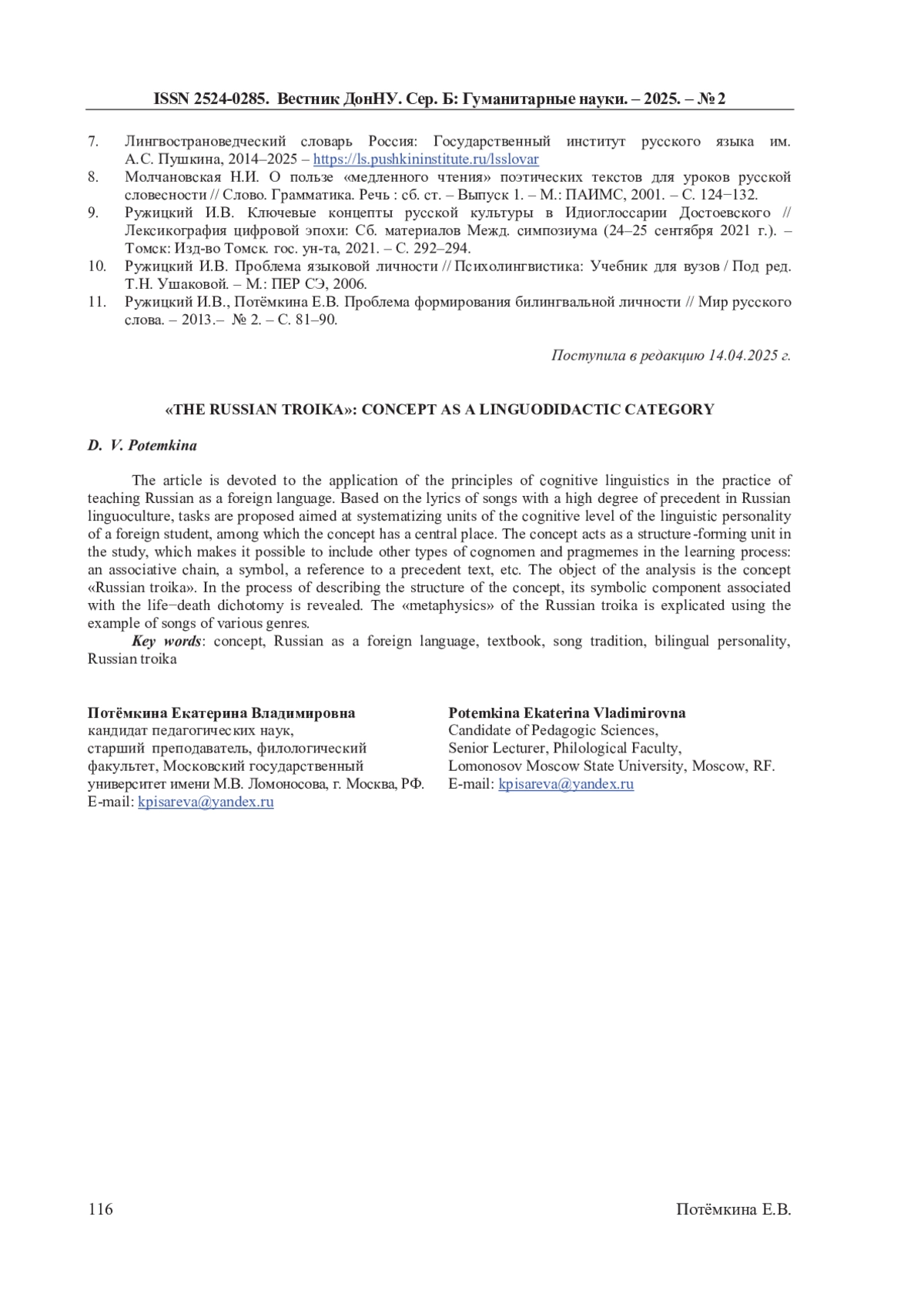 11. Ружицкий И.В., Потёмкина Е.В. Проблема формирования билингвальной личности // Мир русского слова. - 2013.- № 2. - С. 81-90. EDN: QZGYMV