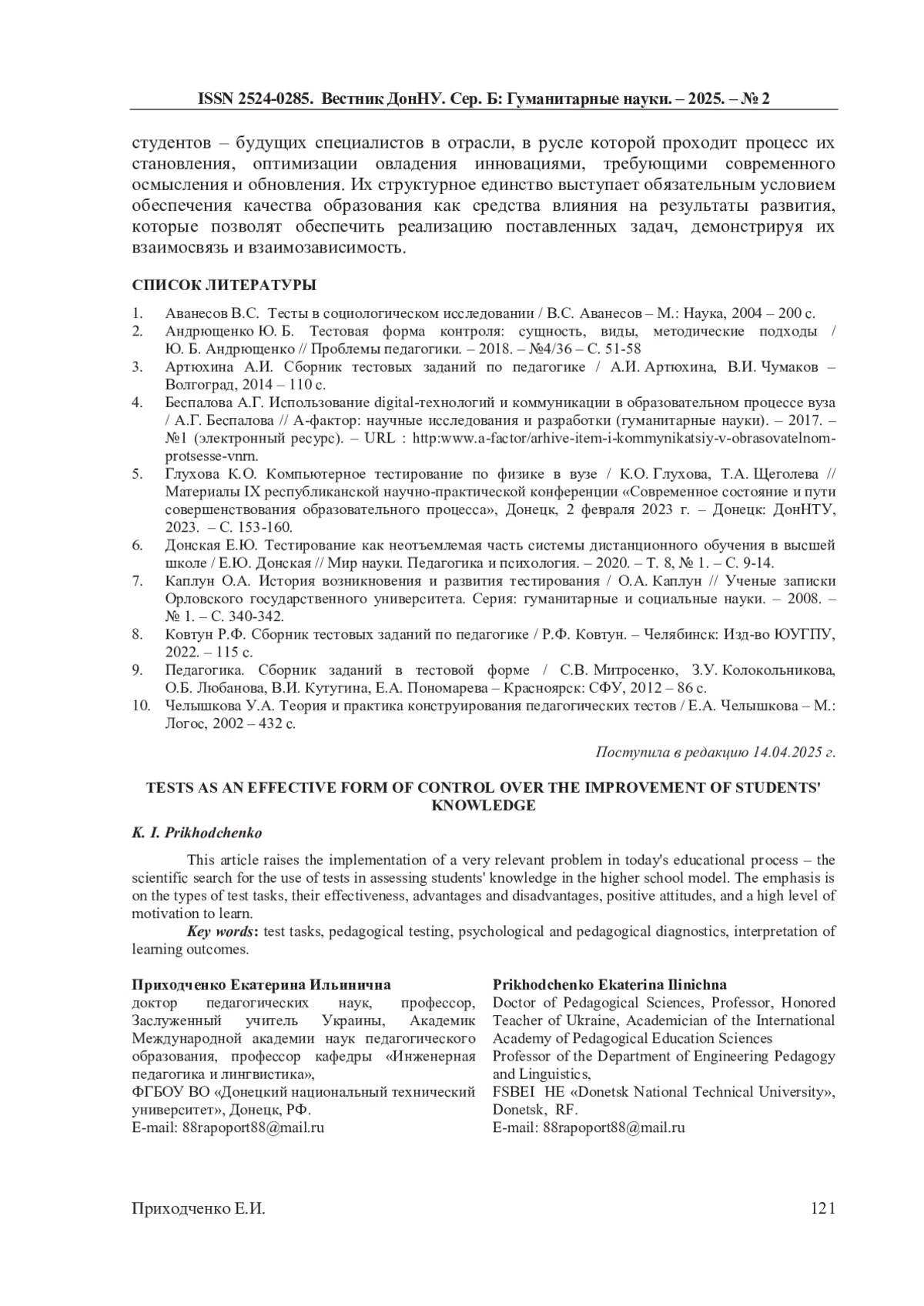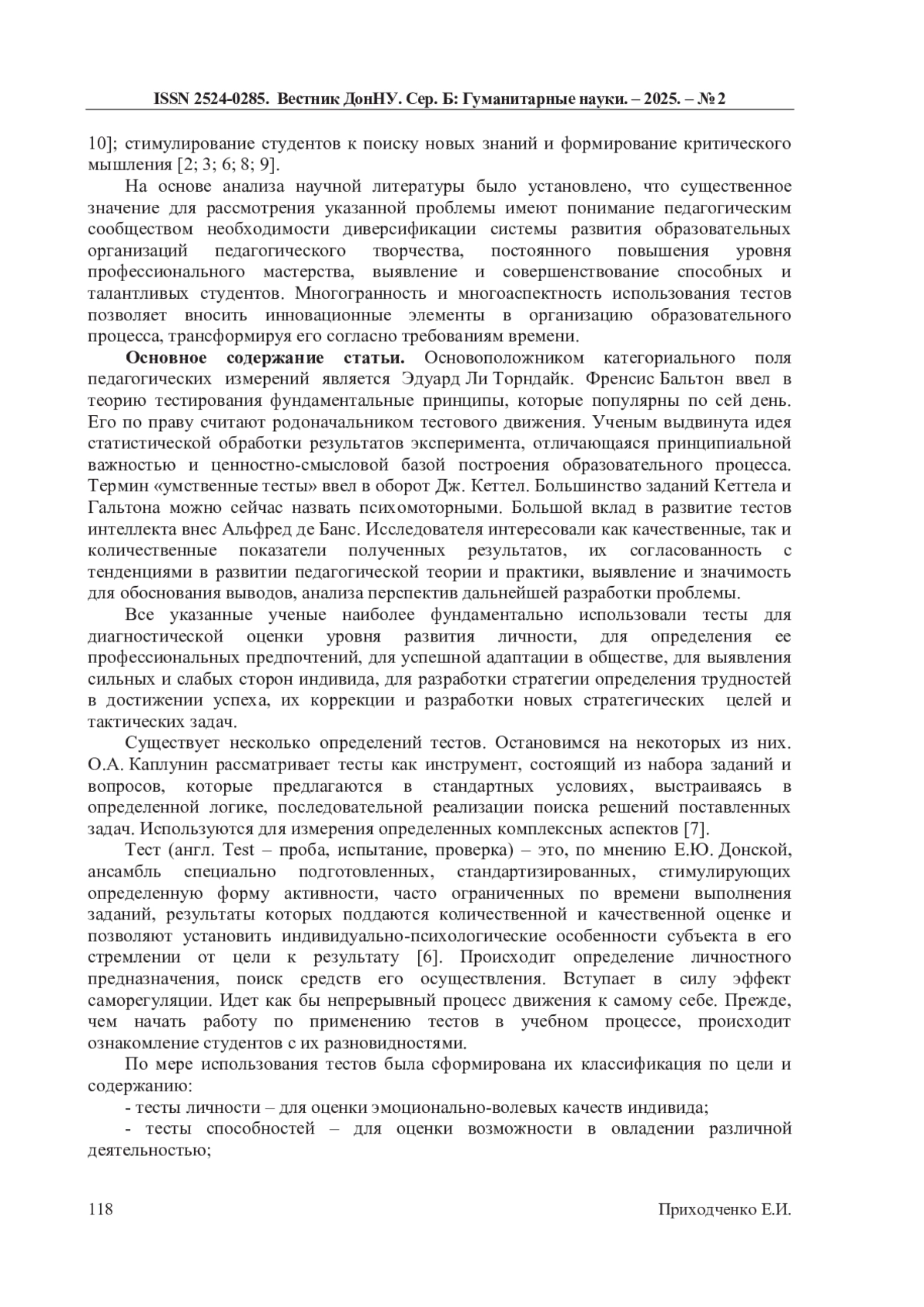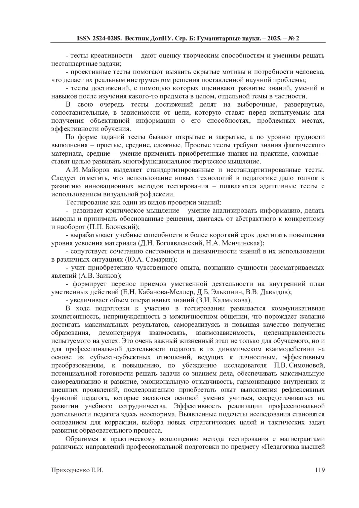 6. Донская Е.Ю. Тестирование как неотъемлемая часть системы дистанционного обучения в высшей школе / Е.Ю. Донская // Мир науки. Педагогика и психология. - 2020. - Т. 8, № 1. - С. 9-14. EDN: ILYBZB