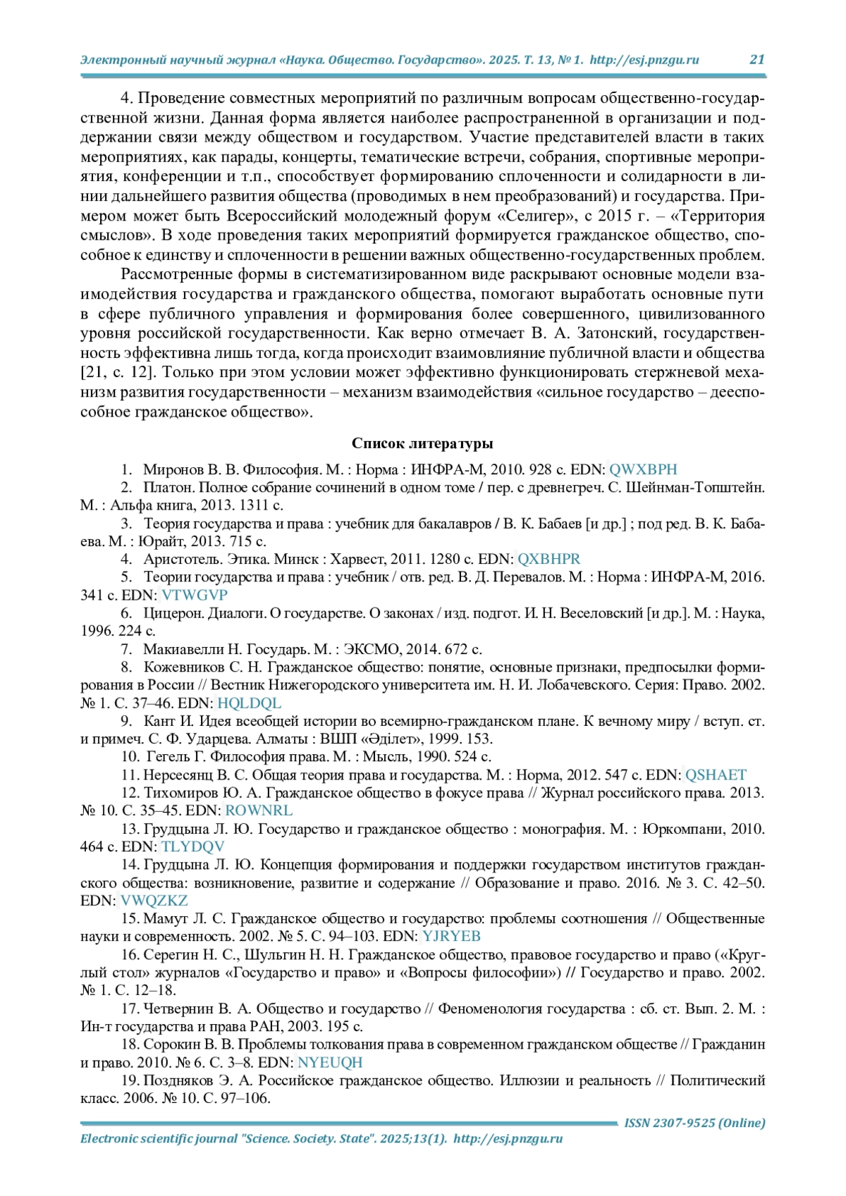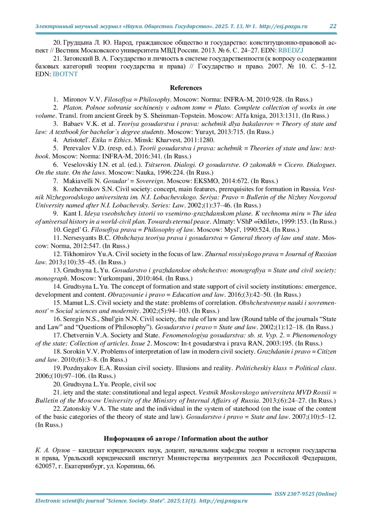 21. Затонский В. А. Государство и личность в системе государственности (к вопросу о содержании базовых категорий теории государства и права) // Государство и право. 2007. № 10. С. 5-12. EDN: IBOTNT