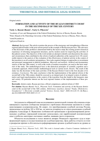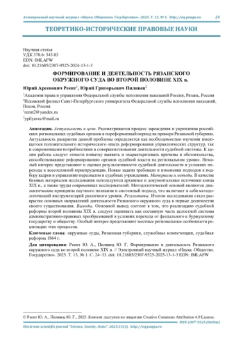 Актуальность и цели. Рассматривается процесс зарождения и укрепления российских региональных судебных органов в пореформенный период на примере Рязанской губернии. Актуальность раскрытия данной проблемы определяется как необходимостью изучения имеющегося положительного исторического опыта реформирования управленческих структур, так и современными потребностями в совершенствовании деятельности судебной системы. К целям работы следует отнести попытку выявить и охарактеризовать причины и обстоятельства, способствовавшие реформированию органов судебной власти на региональном уровне. Немалый интерес представляют и оценки результативности судебной деятельности в условиях перехода к всесословной юриспруденции. Новые задачи требовали и изменения подходов к подбору кадров и управлению персоналом в судебных учреждениях. Материалы и методы. В качестве базовых материалов исследования используются архивные и документальные источники конца XIX в., а также труды современных исследователей. Методологической основой являются диалектические принципы научного познания и системный подход, что включает в себя методологический инструментарий различного уровня. Результаты. Итогом исследования стало раскрытие основных направлений деятельности Рязанского окружного суда в первые десятилетия своего существования. Выводы. Основной вывод состоит в том, что реализацию судебной реформы второй половины XIX в. следует оценивать как составную часть целостной системы административно-правовых преобразований в условиях перехода от феодального к буржуазному государству и обществу. Особый интерес представляют местные региональные особенности реализации этих процессов.