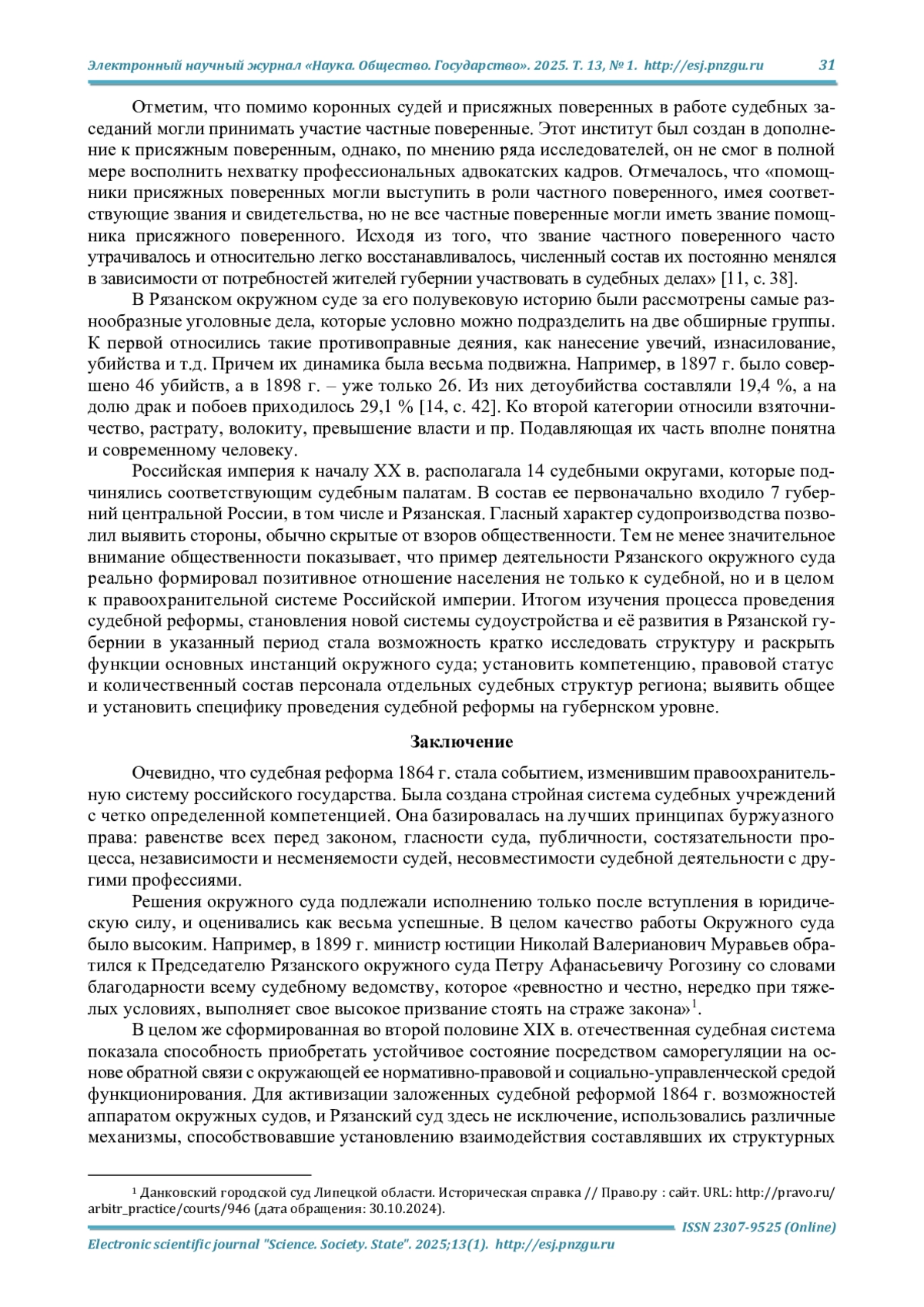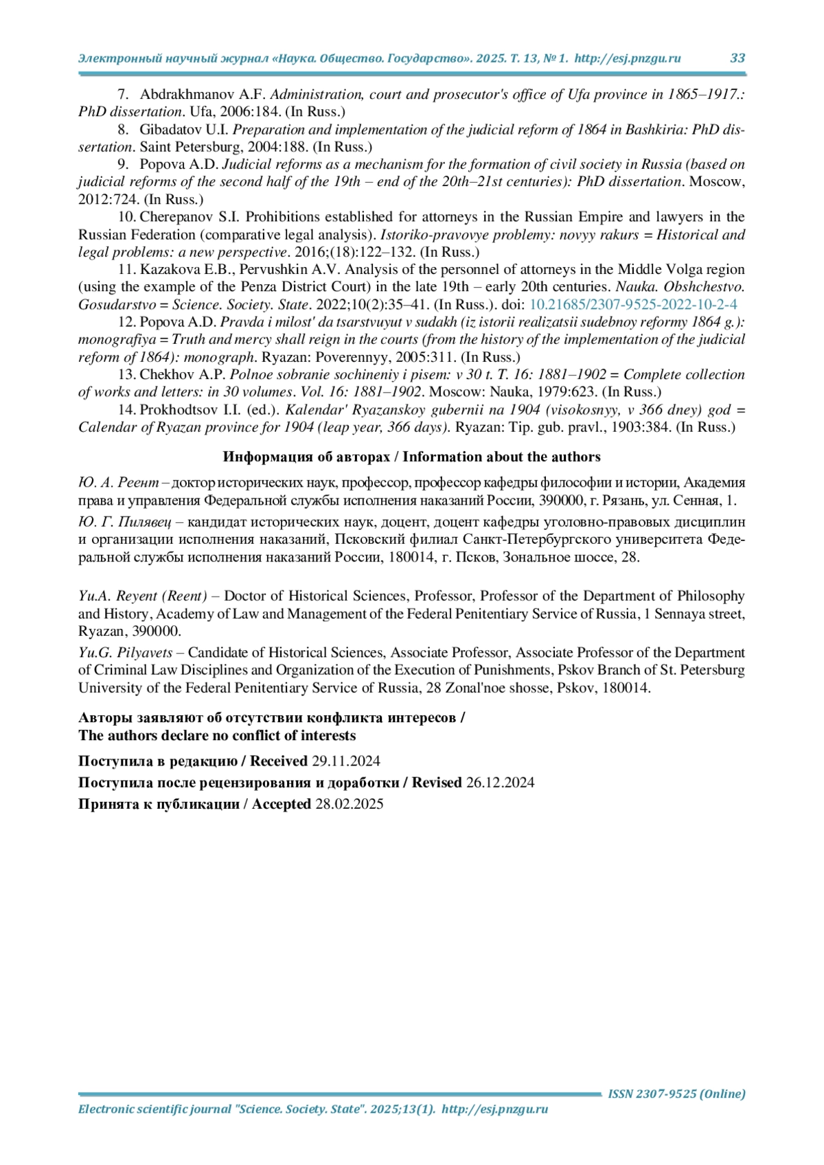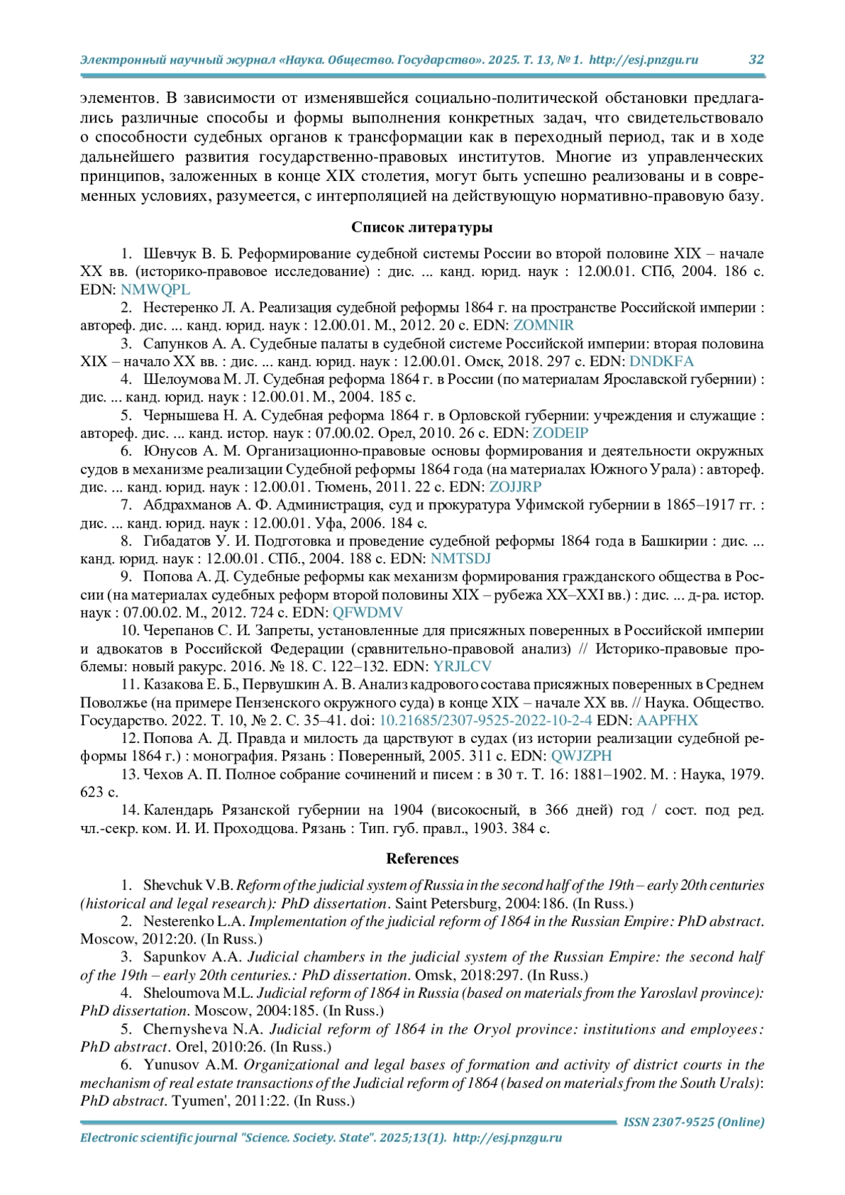 11. Казакова Е. Б., Первушкин А. В. Анализ кадрового состава присяжных поверенных в Среднем Поволжье (на примере Пензенского окружного суда) в конце XIX - начале ХХ вв. // Наука. Общество. Государство. 2022. Т. 10, № 2. С. 35-41. DOI: 10.21685/2307-9525-2022-10-2-4 EDN: AAPFHX