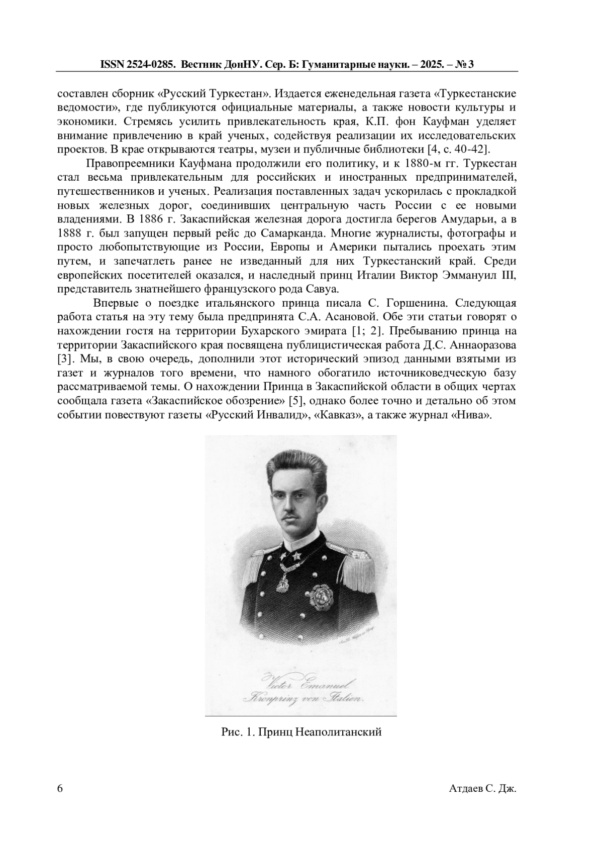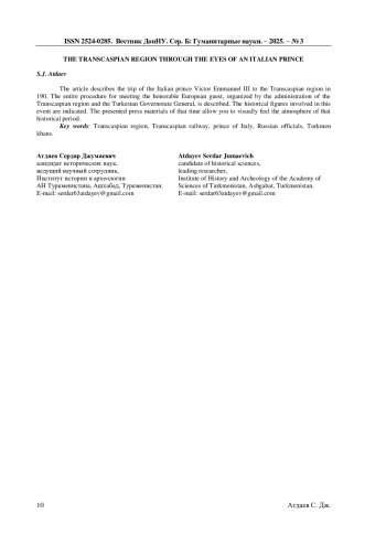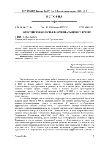 Представленная на рассмотрение работа посвящена поездке наследного принца Италии Виктора Эммануила III (1869–1947) в Закаспийскую область, предпринятой им в 1890 г.