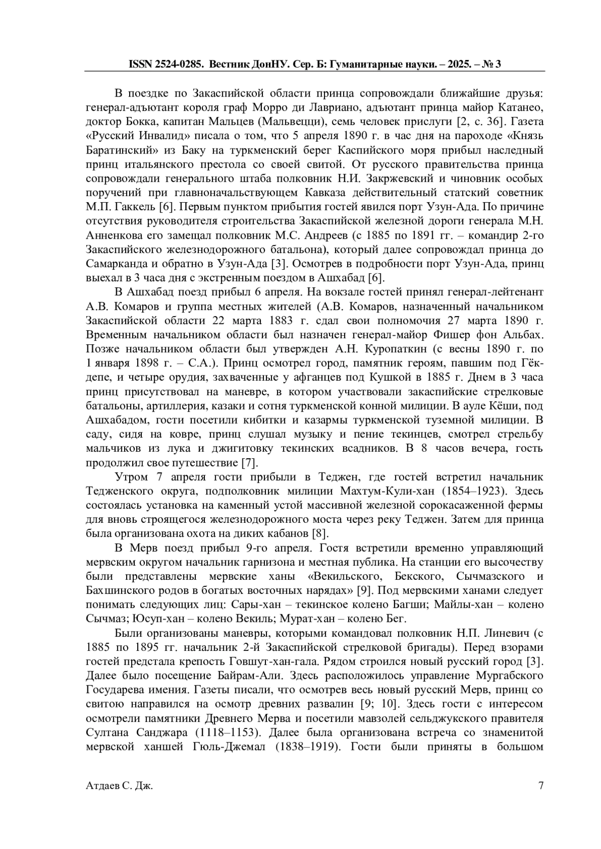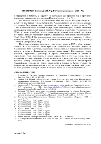 3. Аннаоразов Д.С. Путешествие итальянского принца по туркменской земле [Электронный ресурс] / Д.С. Аннаоразов. - URL: https://www.infoabad.com/2119-puteshestvie-italjanskogo-princa-po-turkmenskoi-zemle.html (дата обращения 21.07.2025).