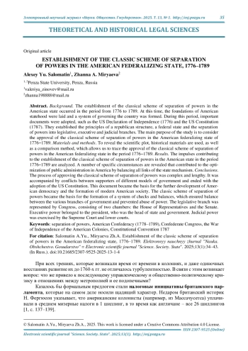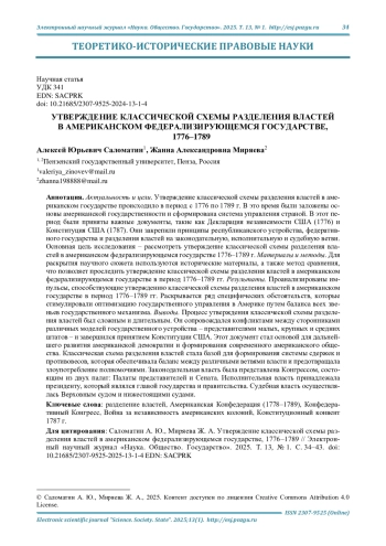 Актуальность и цели. Утверждение классической схемы разделения властей в американском государстве происходило в период с 1776 по 1789 г. В это время были заложены основы американской государственности и сформирована система управления страной. В этот период были приняты важные документы, такие как Декларация независимости США (1776) и Конституция США (1787). Они закрепили принципы республиканского устройства, федеративного государства и разделения властей на законодательную, исполнительную и судебную ветви. Основная цель исследования - рассмотреть утверждение классической схемы разделения властей в американском федерализирующемся государстве 1776-1789 г. Материалы и методы. Для раскрытия научного сюжета используются исторические материалы, а также метод сравнения, что позволяет проследить утверждение классической схемы разделения властей в американском федерализирующемся государстве в период 1776-1789 гг. Результаты. Проанализированы импульсы, способствующие утверждению классической схемы разделения властей в американском государстве в период 1776-1789 гг. Раскрывается ряд специфических обстоятельств, которые стимулировали оптимизацию государственного управления в Америке путем баланса всех звеньев государственного механизма. Выводы. Процесс утверждения классической схемы разделения властей был сложным и длительным. Он сопровождался конфликтами между сторонниками различных моделей государственного устройства - представителями малых, крупных и средних штатов - и завершился принятием Конституции США. Этот документ стал основой для дальнейшего развития американской демократии и формирования современного американского общества. Классическая схема разделения властей стала базой для формирования системы сдержек и противовесов, которая обеспечивала баланс между различными ветвями власти и предотвращала злоупотребление полномочиями. Законодательная власть была представлена Конгрессом, состоящим из двух палат: Палаты представителей и Сената. Исполнительная власть принадлежала президенту, который являлся главой государства и правительства. Судебная власть осуществлялась Верховным судом и нижестоящими судами.