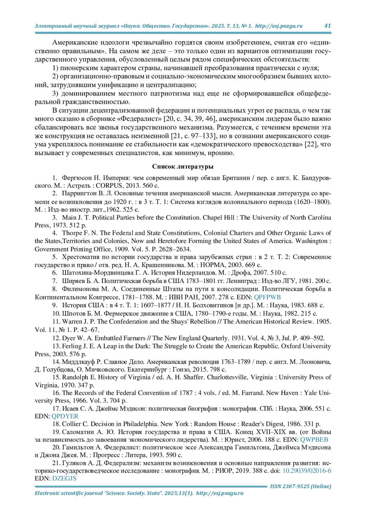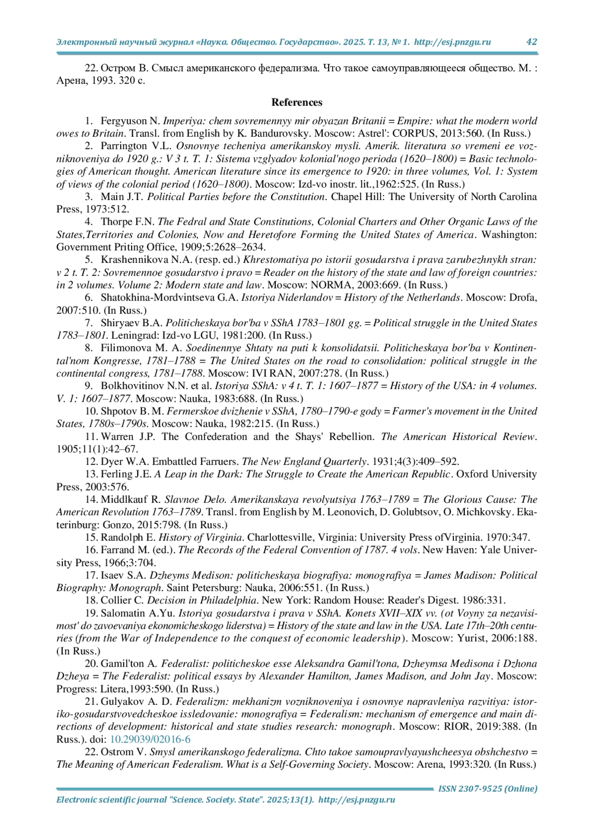 8. Филимонова М. А. Соединенные Штаты на пути к консолидации. Политическая борьба в Континентальном Конгрессе, 1781-1788. М.: ИВИ РАН, 2007. 278 с. EDN: QPFPWB