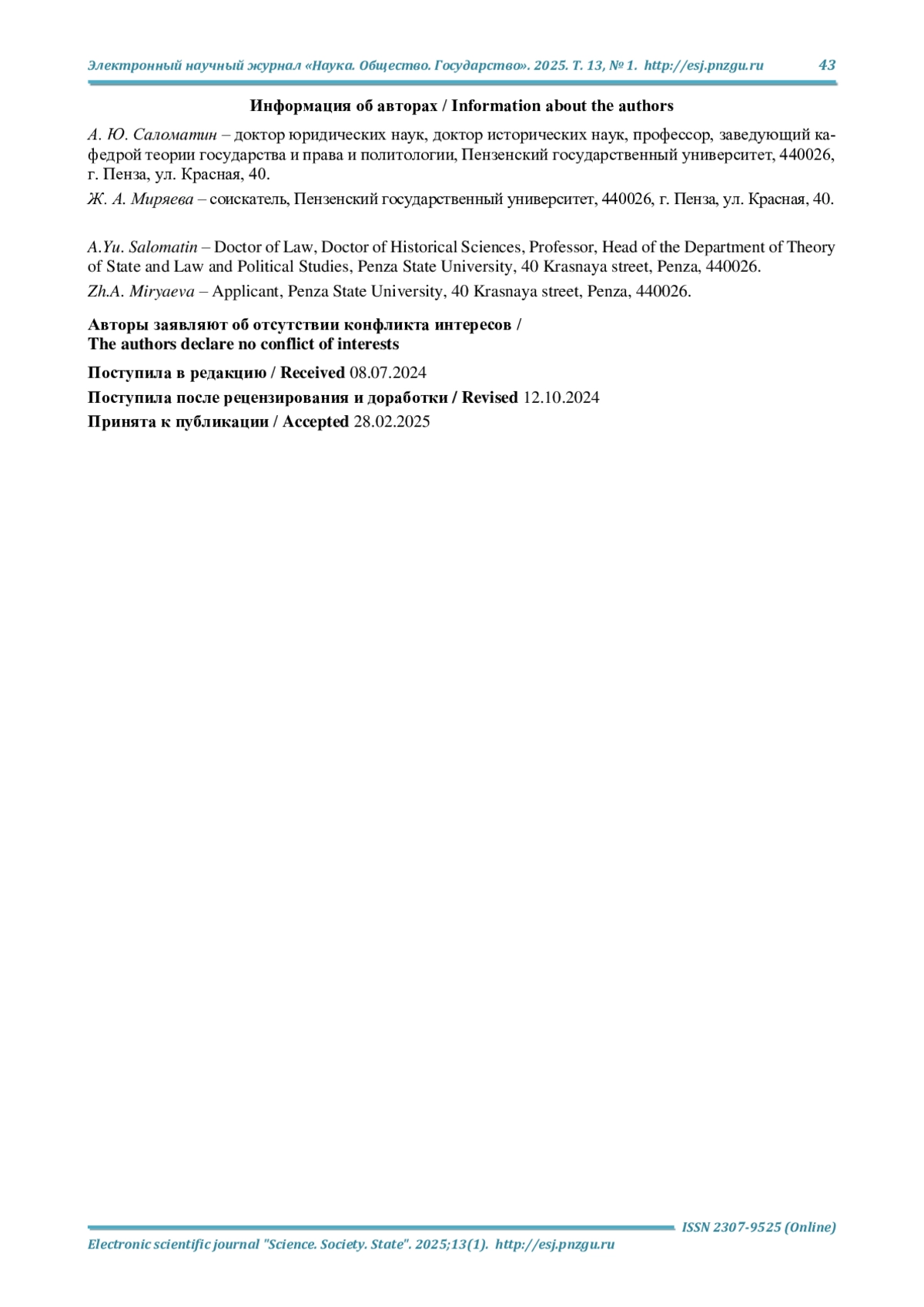 Выводы. На основе проведенного анализа в вопросах правопреемства Российской Федерацией бывшего СССР сделан вывод о частичном правопреемстве, поскольку черты предыдущего государства не были утрачены и одна его часть осталась Российской Федерацией, сохранив свои права и обязанности. Следовательно, в данном случае необходимо говорить о континуитете государства, предполагающем непрерывность его существования, в том числе и после его раздела. Российская Федерация в этой связи является не просто правопреемником, а государством-продолжателем СССР. Это правопреемство прослеживается как в роли и месте России в международных отношениях, так и в вопросах безопасности государства, в основах конституционного строя, в государственном строительстве, в традиционных ценностях, доставшихся нам от предыдущих эпох.