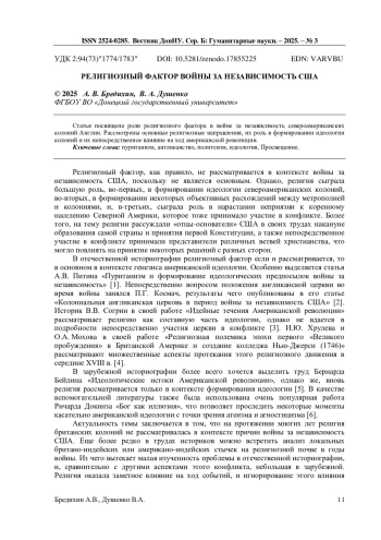 Статья посвящена роли религиозного фактора в войне за независимость североамериканских колоний Англии. Рассмотрены основные религиозные направления, их роль в формировании идеологии колоний и их непосредственное влияние на ход американской революции.