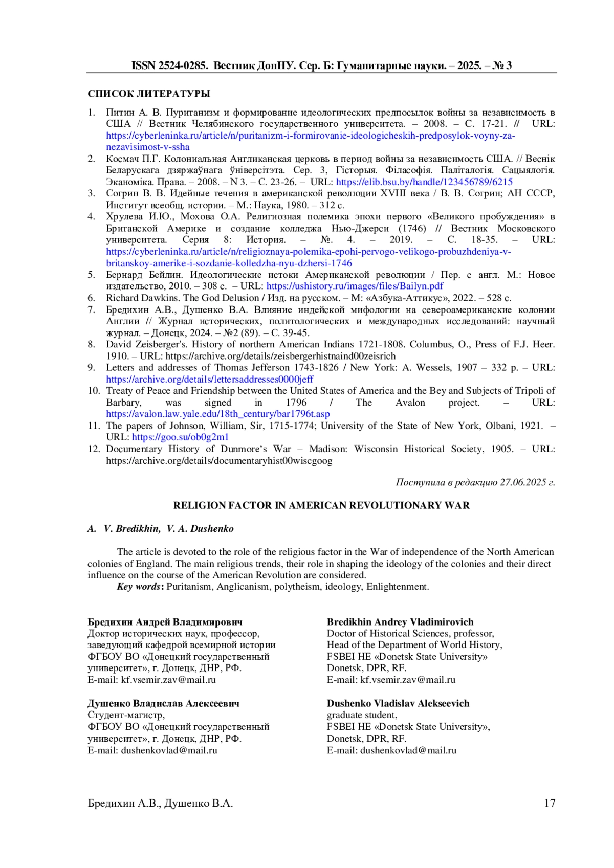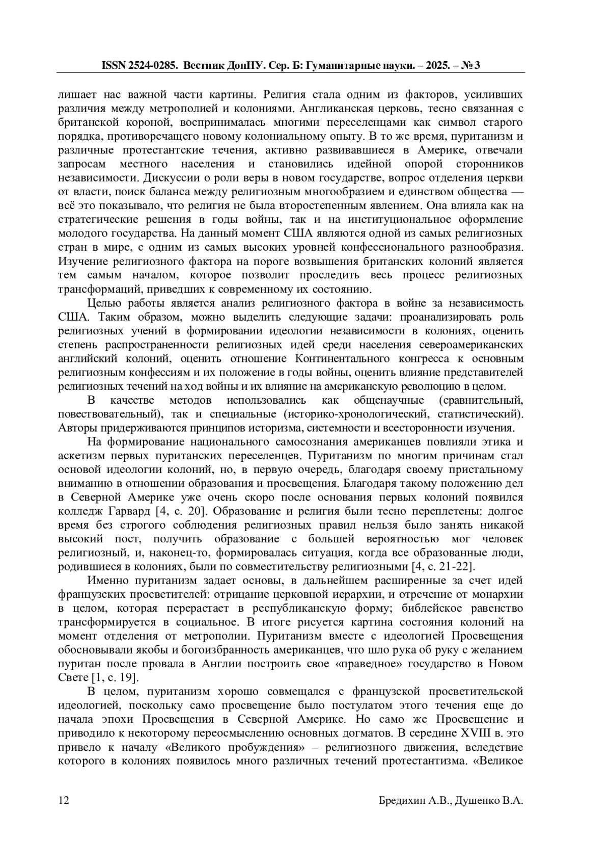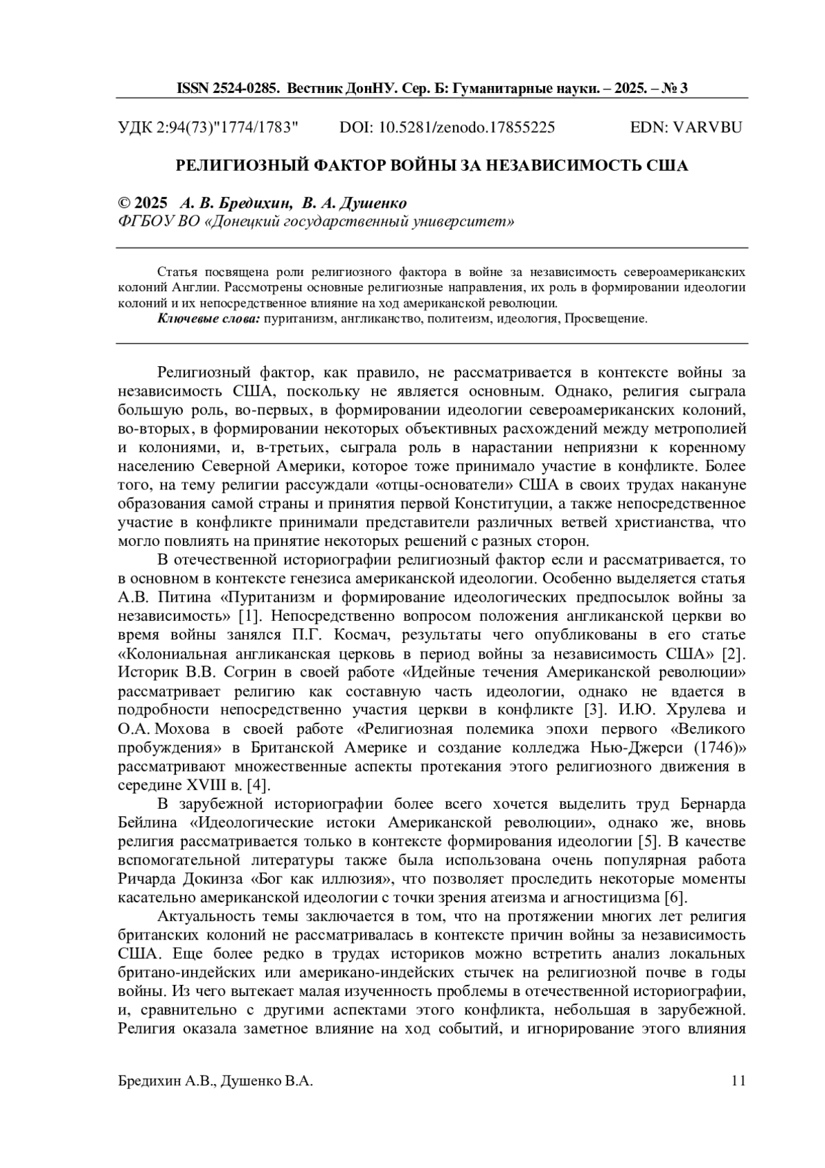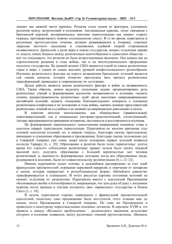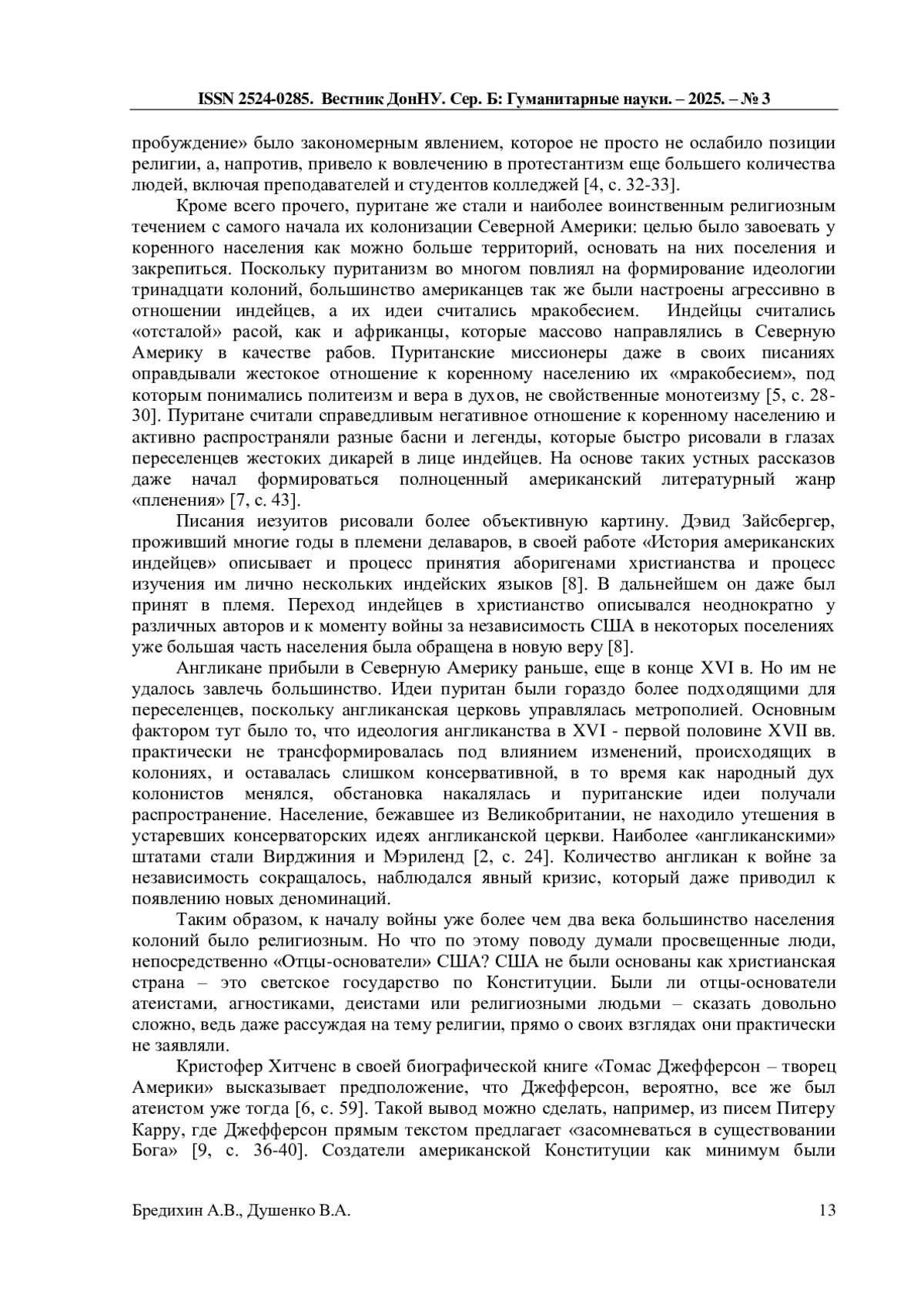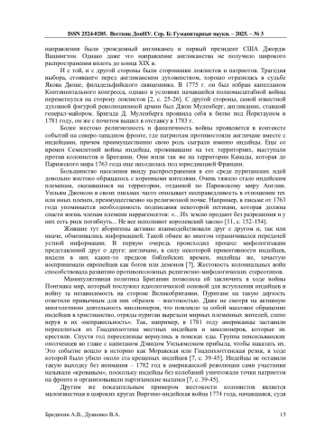 7. Бредихин А.В., Душенко В.А. Влияние индейской мифологии на североамериканские колонии Англии // Журнал исторических, политологических и международных исследований: научный журнал. - Донецк, 2024. - №2 (89). - С. 39-45. EDN: BBXIMN