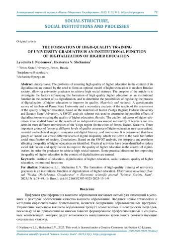 Выводы. На основе SWOT-анализа выявлены перспективы и проблемы, влияющие на качество высшего образования. Определены практические направления деятельности для снижения факторов социальных рисков и применения факторов совершенствования качества высшего образования в условиях цифровизации с целью достижения выпускниками высоких социальных статусов. Названы некоторые практические направления совершенствования качества высшего образования в условиях цифровизации.
