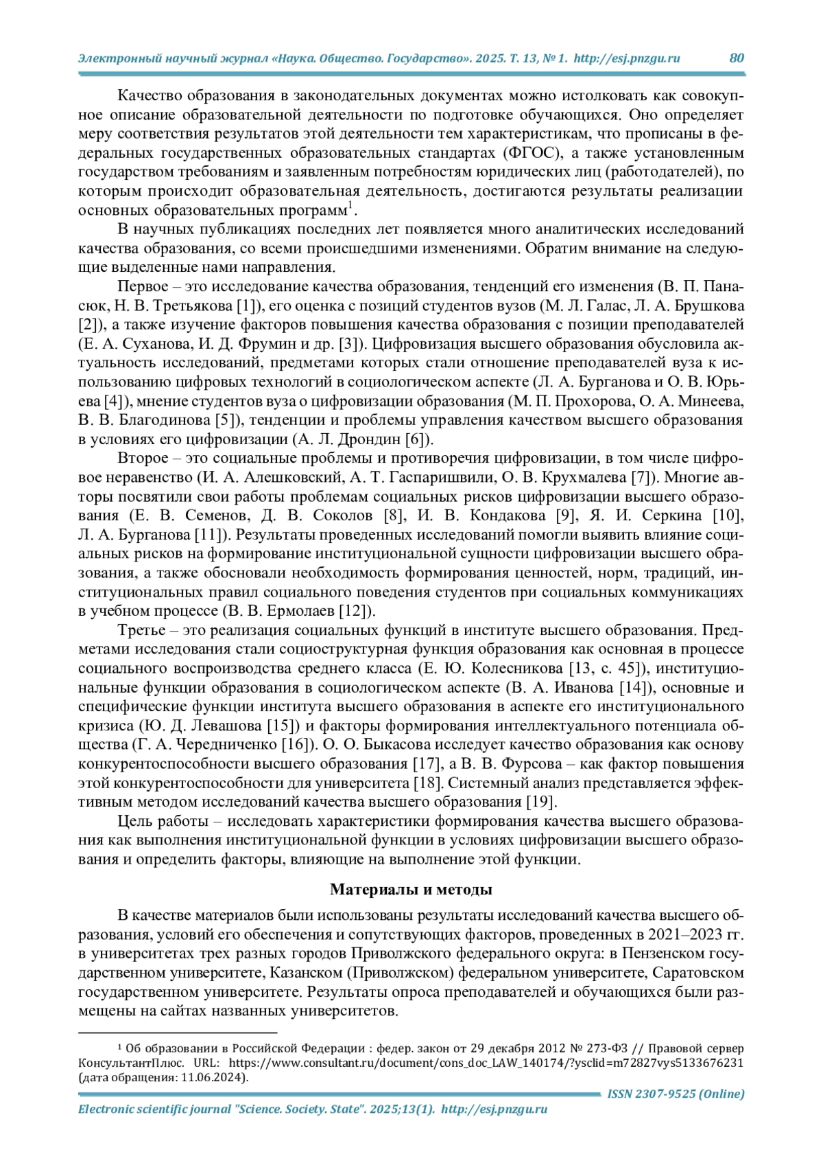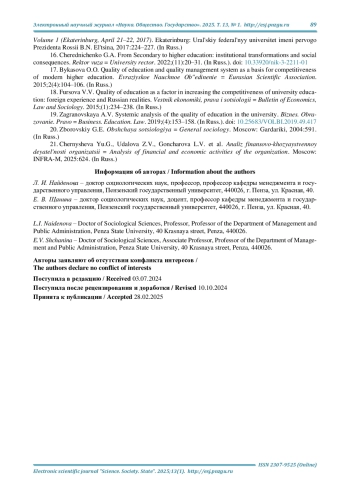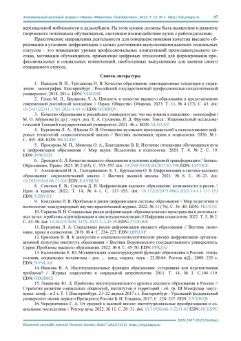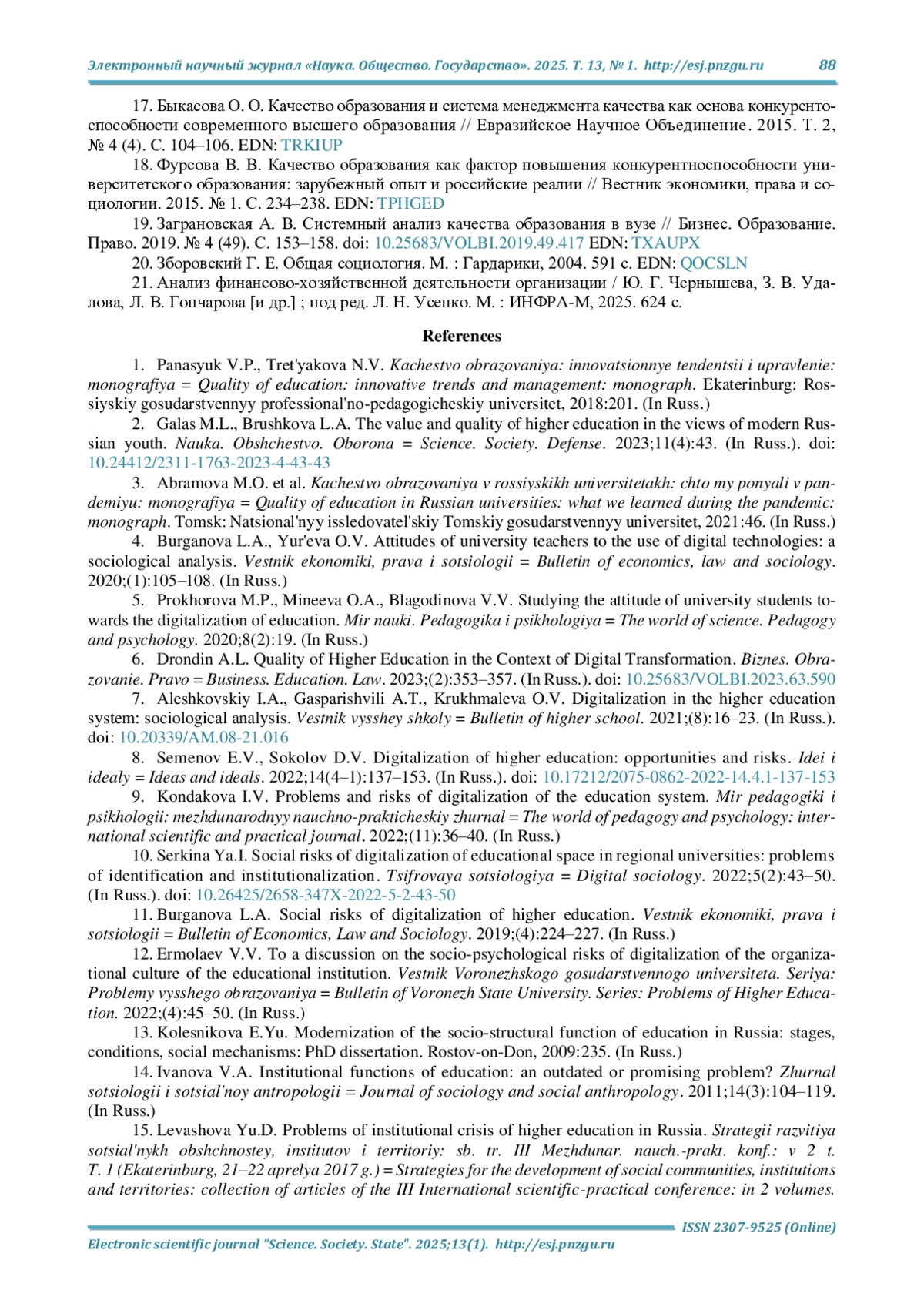 2. Галас М. Л., Брушкова Л. А. Ценность и качество высшего образования в представлениях современной российской молодёжи // Наука. Общество. Оборона. 2023. Т. 11, № 4 (37). С. 43. DOI: 10.24412/2311-1763-2023-4-43-43 EDN: HURBQV