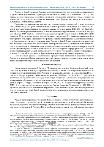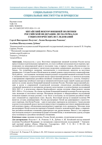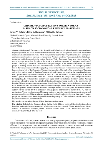 Актуальность и цели. Восточное направление внешней политики России всегда присутствовало в региональных приоритетах, но стало особенно актуальным после перемен, произошедших на международной арене в последние годы, в первую очередь обусловленных новыми политическими реалиями и значительно возросшим санкционным давлением со стороны Запада. Это потребовало смещения экономических и политических акцентов на восточное направление. Сегодня Россия и Китай вышли на новый уровень стратегического взаимодействия. Цель работы - исследование эволюции концептуальных положений внешней политики России в отношении Китая и социологический анализ представлений россиян, и в частности молодежи, о выстраивании современных российско-китайских отношений. Материалы и методы. Концептуальные параметры китайского вектора во внешнеполитическом курсе нашей страны рассматриваются на основе анализа Концепций внешней политики России. Изучение представлений россиян в целом и современной студенческой молодежи относительно российско-китайских отношений проводится по материалам авторских качественных и количественных исследований 2024-2025 гг. и результатам опросов Всероссийского центра изучения общественного мнения 2023-2024 гг. Результаты. На основе изучения Концепций внешней политики России представлена эволюция ее восточного вектора. Материалы авторских и общероссийских исследований позволили выявить взгляды россиян, в том числе и молодежи, на построение российско-китайских отношений на современном этапе. Выводы. Восточный вектор во внешней политике РФ является сегодня доминирующим. Россия рассматривает Китай как равноправного стратегического партнера. Для Китая Россия - один из выгодных партнеров на континенте. Среди россиян в целом и в молодежной среде в частности присутствует поддержка восточного направления внешней политики страны с обозначением вынужденного характера этого «разворота». Молодые люди рассматривают Китай в качестве партнера в большей степени в экономической сфере, а современные российско-китайские отношения характеризуют как дружественные. Вместе с тем современную молодежь волнуют и возможная будущая гегемония Китая, и экономические угрозы, которые могут возникнуть в российско-китайских отношениях.