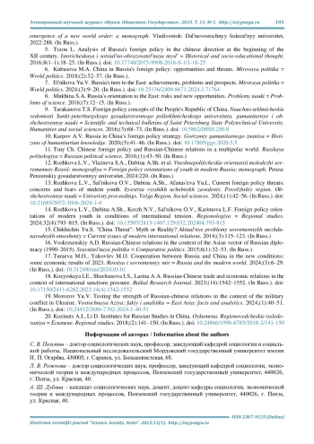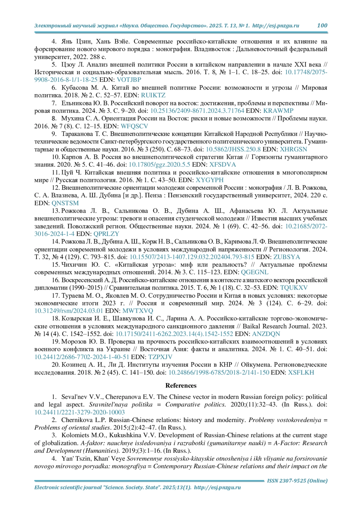 1. Севальнев В. В., Черепанова Е. В. Китайский вектор в современной внешней политике России: политико-правовой аспект // Сравнительная политика. 2020. № 11 (1). С. 32-43. DOI: 10.24411/2221-3279-2020-10003 EDN: XVEQCM