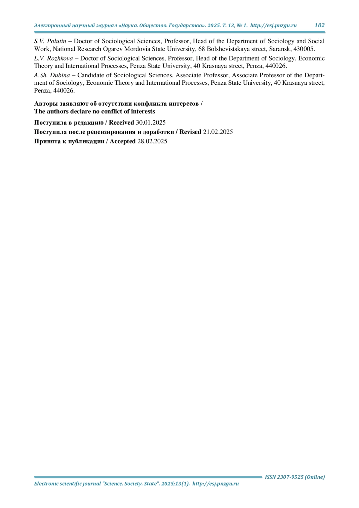 13. Рожкова Л. В., Сальникова О. В., Дубина А. Ш., Афанасьева Ю. Л. Актуальные внешнеполитические угрозы: тревоги и опасения студенческой молодежи // Известия высших учебных заведений. Поволжский регион. Общественные науки. 2024. № 1 (69). С. 42-56. DOI: 10.21685/2072-3016-2024-1-4 EDN: QPRLZY