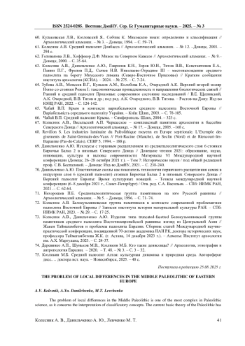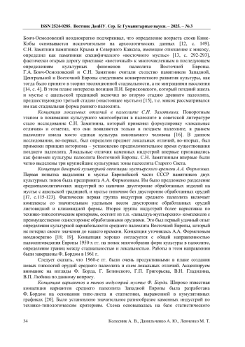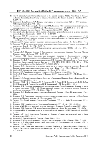 72. Колесник А.В. Белокузьминовская группа памятников в контексте современной проблематики палеолита Восточной Европы // Записки института истории материальной культуры РАН. - СПб: ИИМК РАН, 2023. - № 29. - С. 17-25. EDN: AYXGWC