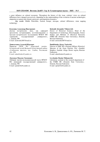 69. Данильченко А.Ю. Нуклеусы с торцовым расщеплением из среднепалеолитического слоя 6 стоянки Бирючья Балка 2 в низовьях Северского Донца // Донецкие чтения 2021: образование, наука, инновации, культура и вызовы современности: Материалы VI Международной научной конференции (Донецк, 26-28 октября 2021 г.). - Том 7: Исторические науки / под общей редакцией проф. С.В. Беспаловой. - Донецк: Изд-во ДонНУ, 2021. - С. 238-240. EDN: GTGGES