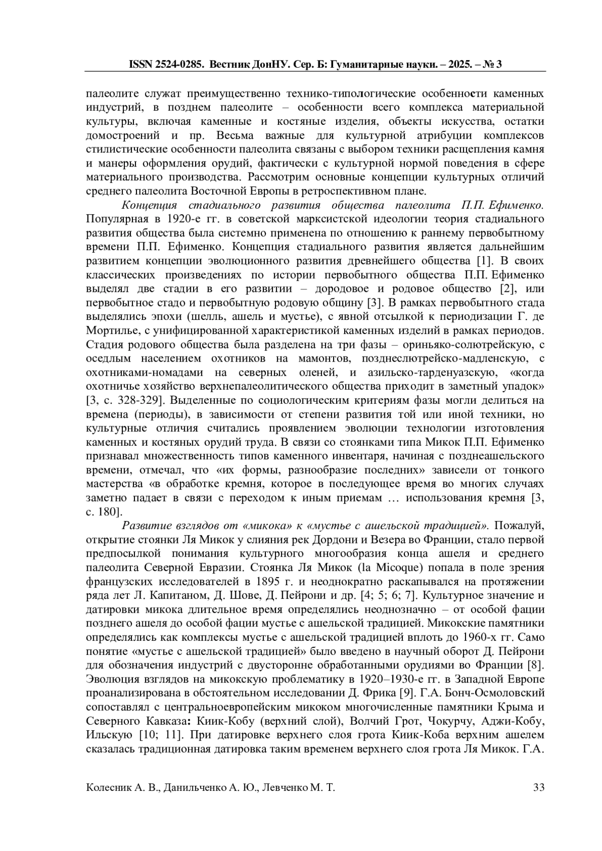 63. Колесник А.В., Данильченко А.Ю., Гаврилов К.Н., Зоров Ю.Н., Титов В.В., Константинов Е.А., Панин П.Г., Фролов П.Д., Сычев Н.В. Николаево-Отрадное III - местонахождение среднего палеолита на берегу Миусского лимана (Северо-Восточное Приазовье) // Краткие сообщения института археологии (КСИА). - 2024. - № 275. - С. 7-24. EDN: BVMCBF