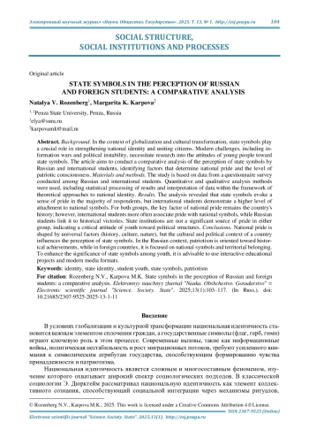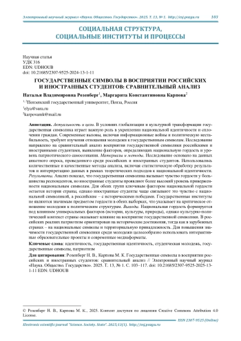 Результаты. Анализ показал, что государственная символика вызывает чувство гордости у большинства респондентов, но иностранные студенты проявляют более высокий уровень приверженности национальным символам. Для обеих групп ключевым фактором национальной гордости остается история страны, однако иностранные студенты чаще связывают это чувство с национальной символикой, а российские - с историческими победами. Государственные институты не являются значимым предметом гордости в обеих выборках, что указывает на критическое отношение молодежи к политическим структурам.