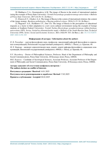 20. Мухаева В. А., Оразмурадова А. М. Образ России в представлениях иностранных студентов (на примере ФГБОУ ВО “Пензенский государственный университет”) // Вестник Пензенского государственного университета. 2017. № 4 (20). С. 36-41. EDN: YUPESF