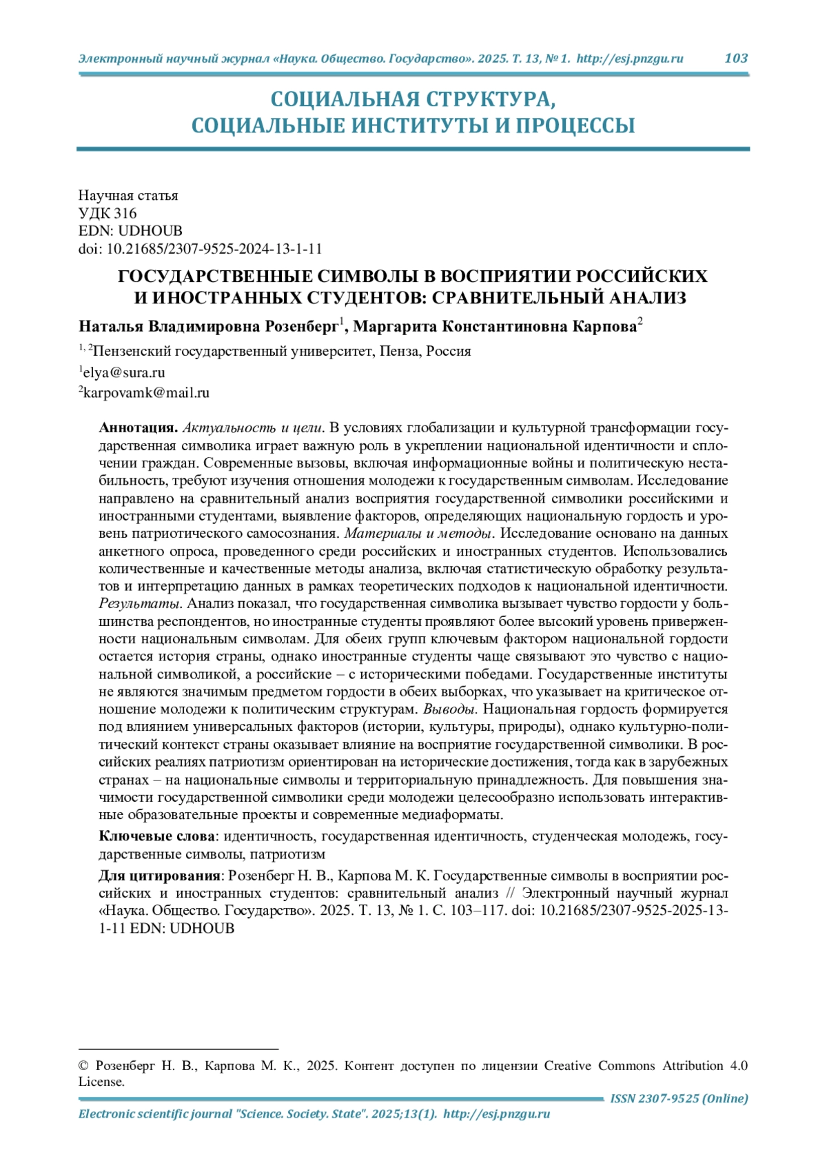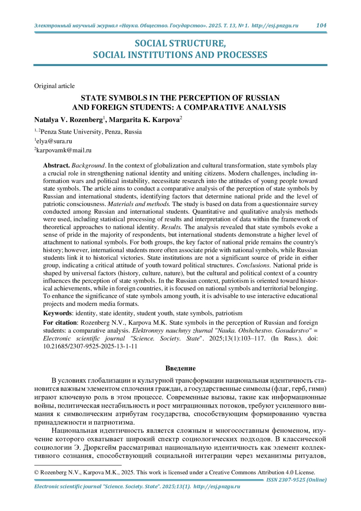 12. Розенберг Н. В., Карпова М. К. Государственная идентичность российской студенческой молодежи (социологический аспект) // Наука. Общество. Государство. 2024. Т. 12, № 3 (47). С. 106-117. DOI: 10.21685/2307-9525-2024-12-3-11 EDN: IKWQLU