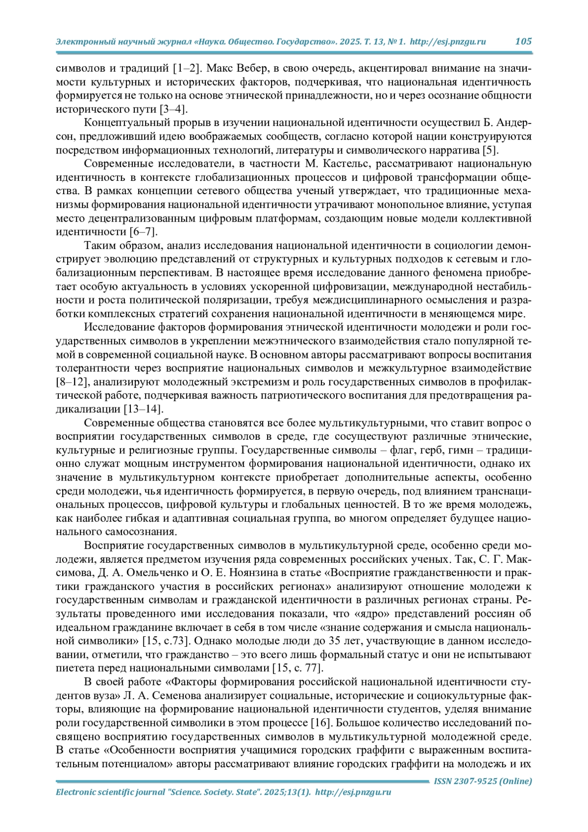 16. Семенова Л. А. Факторы формирования российской национальной идентичности студентов вуза // Вестник Томского государственного университета. Гуманитарные исследования. Humanitates. 2015. Т. 1, № 1. С. 206-214. EDN: TVTAEL