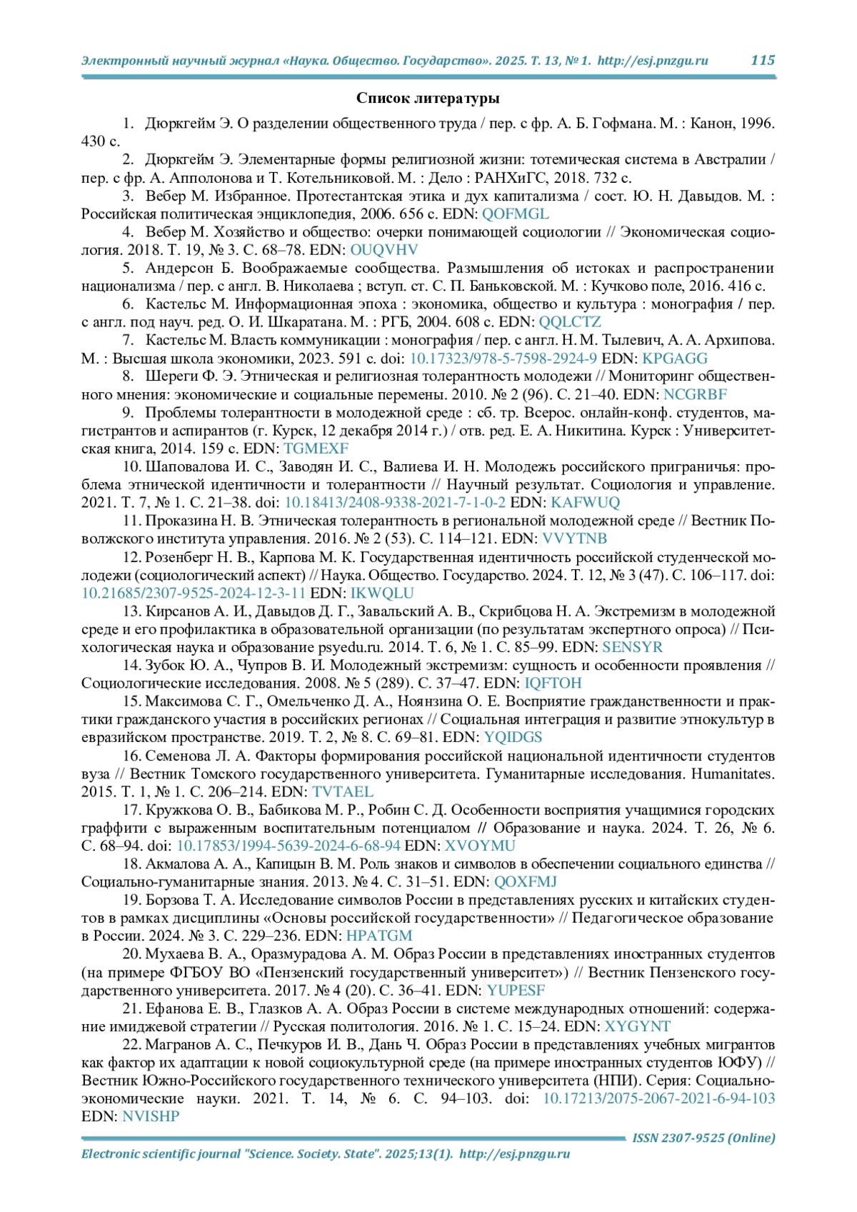 10. Шаповалова И. С., Заводян И. С., Валиева И. Н. Молодежь российского приграничья: проблема этнической идентичности и толерантности // Научный результат. Социология и управление. 2021. Т. 7, № 1. С. 21-38. DOI: 10.18413/2408-9338-2021-7-1-0-2 EDN: KAFWUQ