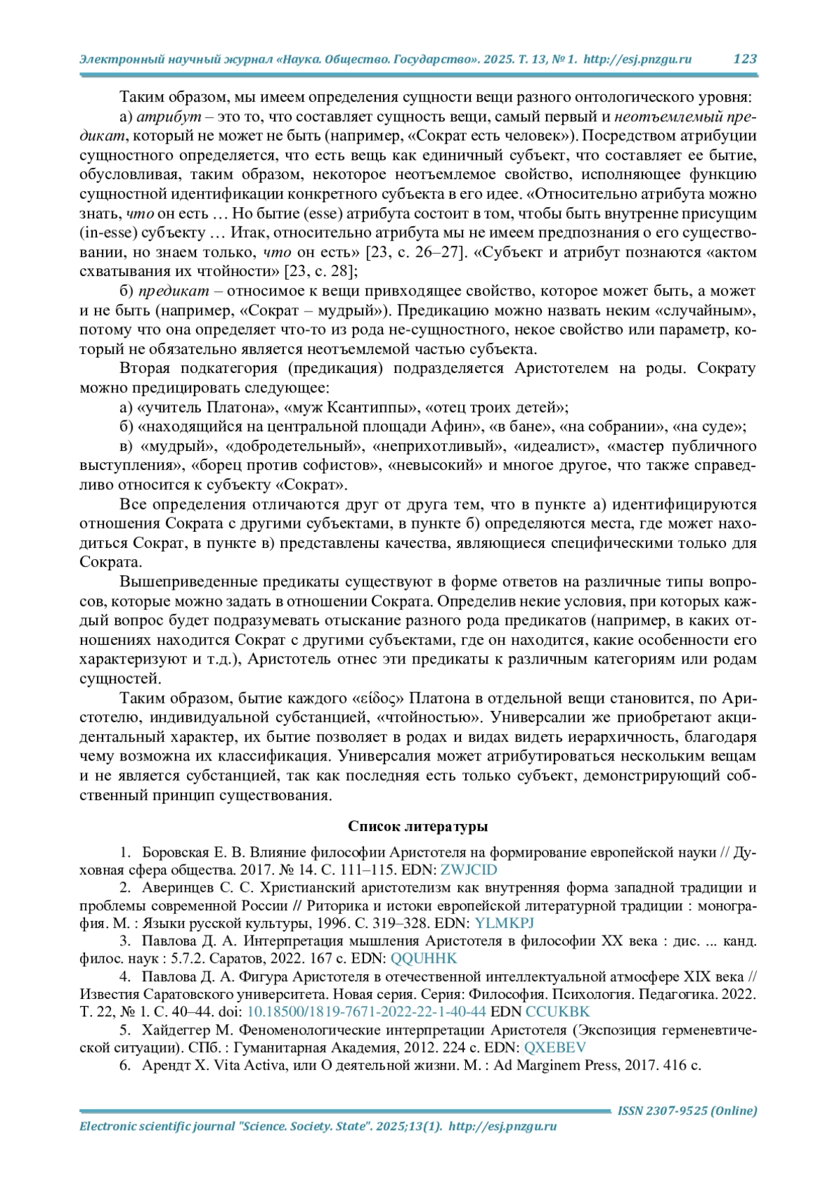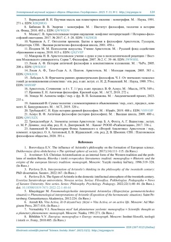 3. Павлова Д. А. Интерпретация мышления Аристотеля в философии ХХ века: дис.. канд. филос. наук: 5.7.2. Саратов, 2022. 167 с. EDN: QQUHHK