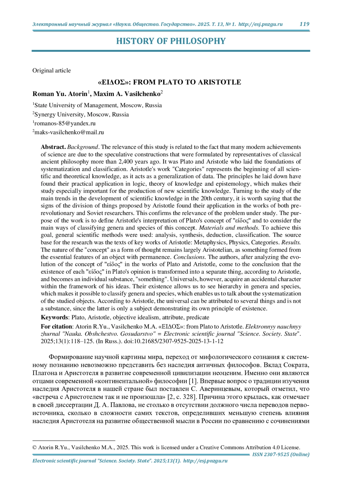 Выводы. На основе анализа эволюции понятия «είδος», представленного в работах Платона и Аристотеля, сделан вывод, что бытие каждого «είδος», по мнению Платона в отдельной вещи, трансформируется, по Аристотелю, и становится индивидуальной субстанцией, «чтойностью». Универсалии же приобретают в рамках его идей акцидентальный характер. Их бытие позволяет в родах и видах видеть иерархичность, благодаря чему возможна их классификация, что дает возможность говорить о систематизации изучаемых объектов. Универсалия же, по Аристотелю, может атрибутироваться нескольким вещам и не является субстанцией, так как последняя есть только субъект, демонстрирующий собственный принцип существования.