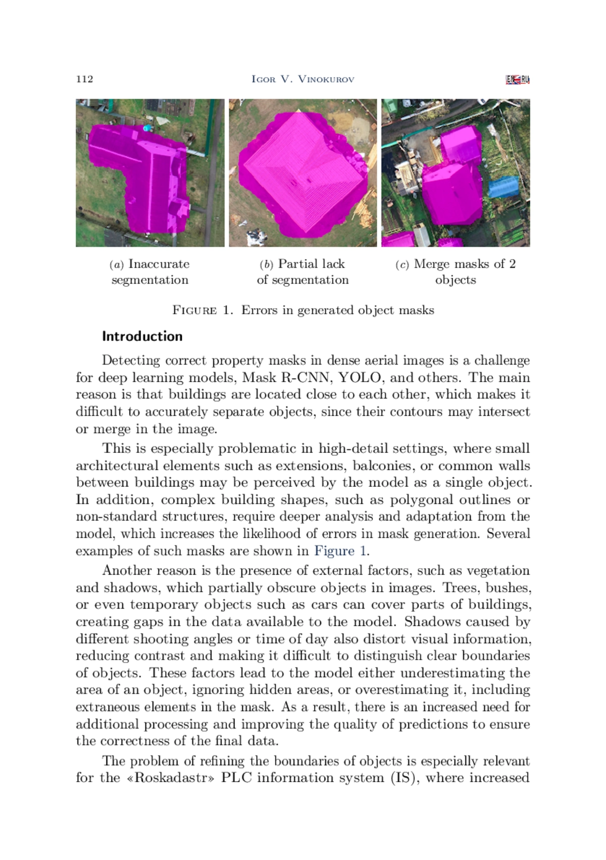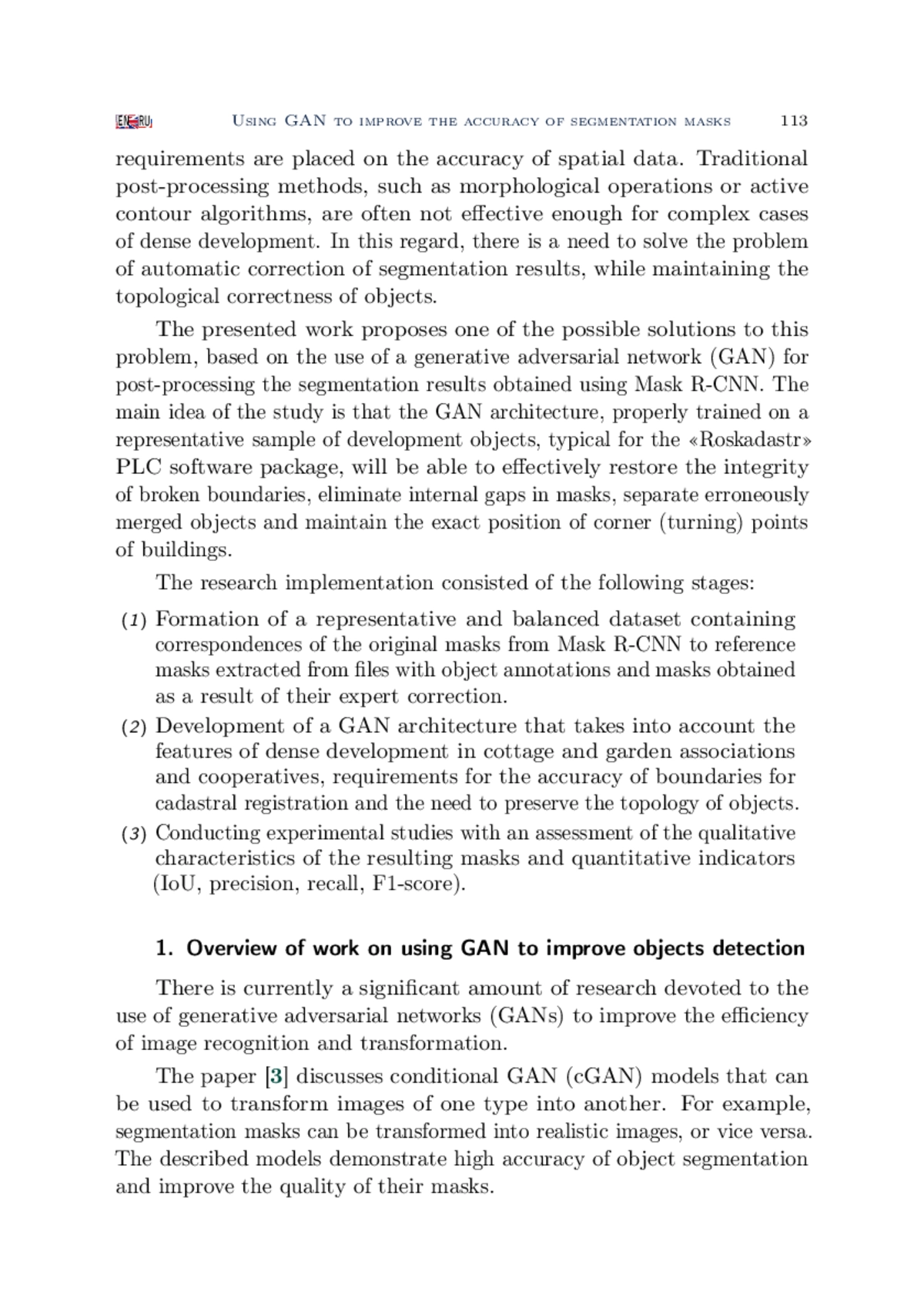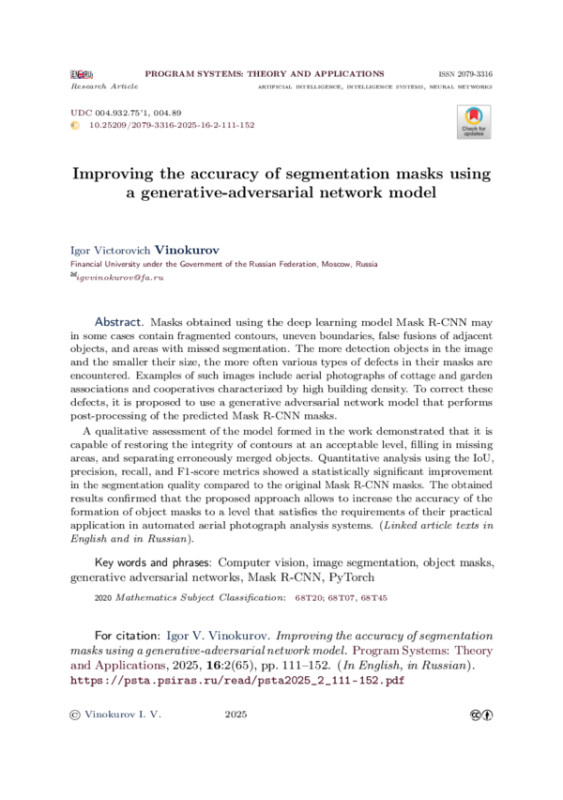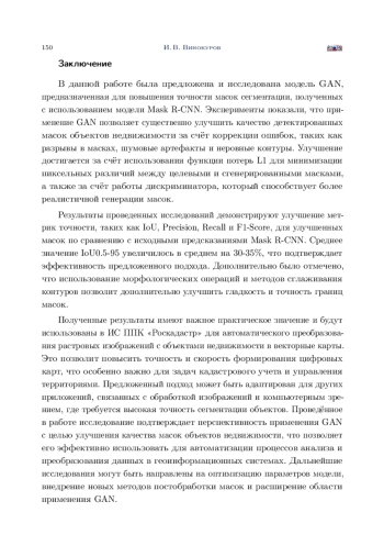 Маски, полученные с использованием модели глубокого обучения Mask R-CNN, в ряде случаев могут содержать фрагментированные контуры, неровные границы, ложные сращивания соседних объектов и участки с пропущенной сегментацией. Чем больше объектов детектирования на изображении и меньше их размер, тем более чаще встречаются различного вида недостатки их масок. Примерами таких изображений могут являться аэрофотоснимки коттеджных и садовых товариществ и кооперативов, характеризующихся высокой плотности застройки. Для коррекции указанных недостатков предлагается использовать модель генеративно-состязательной сети, выполняющую постобработку предсказанных Mask R-CNN масок. Качественная оценка сформированной в работе модели продемонстрировала, что она способна на приемлемом уровне восстанавливать целостность контуров, заполняет пропущенные области и разделять ошибочно объединенные объекты. Количественный анализ по метрикам IoU, precision, recall и F1-score показал статистически значимое улучшение качества сегментации по сравнению с исходными масками Mask R-CNN. Полученные результаты подтвердили, что предложенный подход позволяет довести точность формирования масок объектов до уровня, удовлетворяющего требованиям их практического применения в системах автоматизированного анализа аэрофотоснимков.