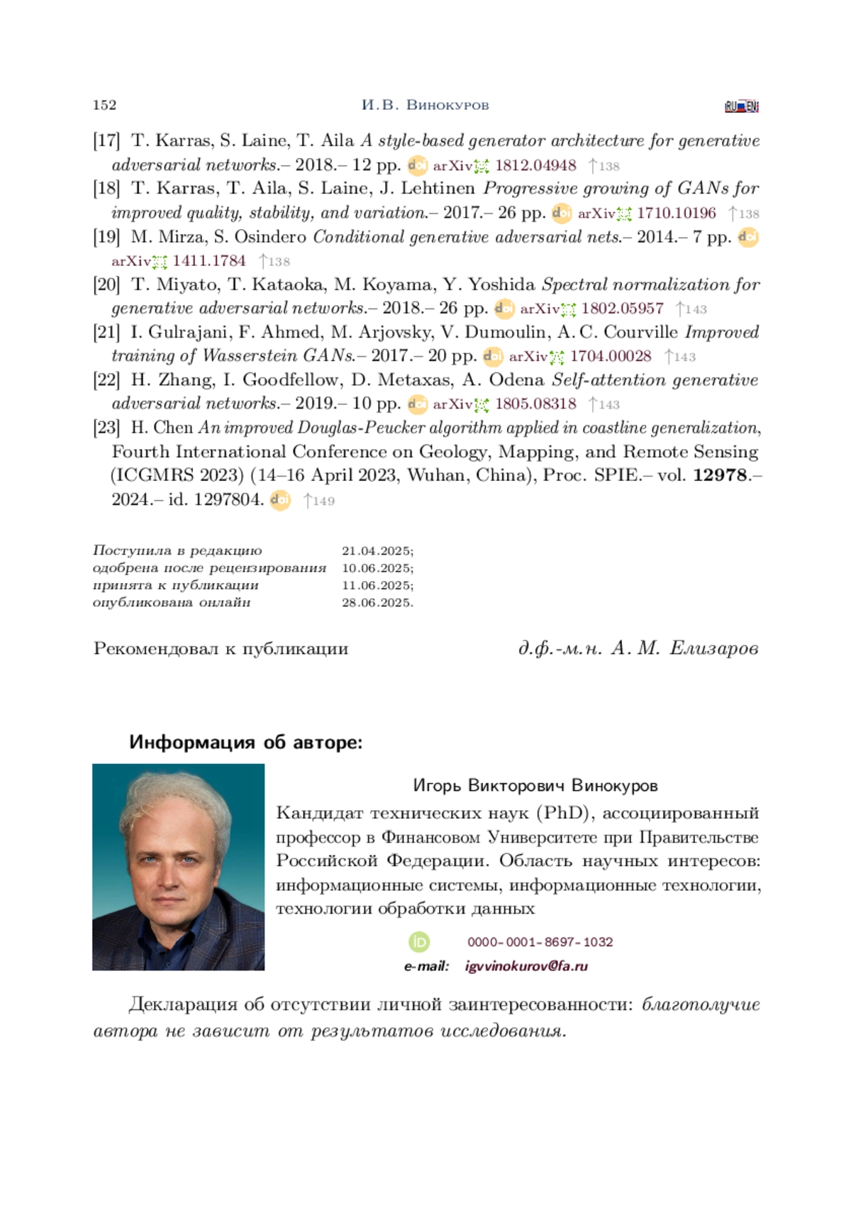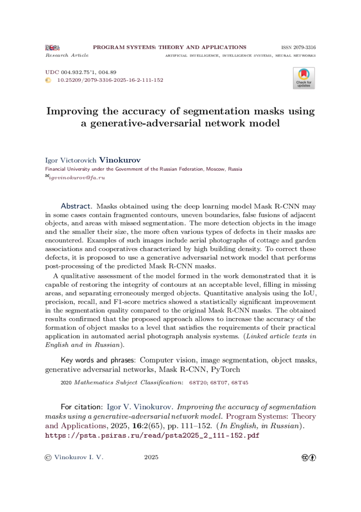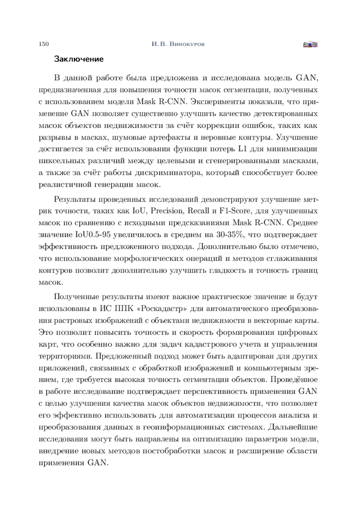 ВИНОКУРОВ И. В. ПОВЫШЕНИЕ ТОЧНОСТИ СЕГМЕНТИРОВАНИЯ ОБЪЕКТОВ С ИСПОЛЬЗОВАНИЕМ ГЕНЕРАТИВНО-СОСТЯЗАТЕЛЬНОЙ СЕТИ