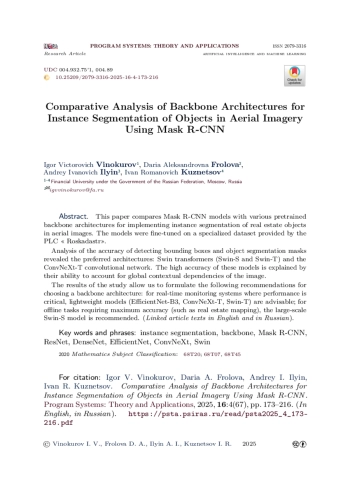 В работе проведено сравнительное исследование моделей Mask R-CNN с различными предобученными backbone-архитектурами для реализации инстанс-сегментации объектов недвижимости на аэрофотоснимках. Модели дообучались на специализированном наборе данных ППК «Роскадастр». Анализ точности детектирования ограничивающих рамок и масок сегментации объектов выявил предпочтительные архитектуры — трансформеры Swin (Swin-S и Swin-T) и свёрточная сеть ConvNeXt-T. Высокая точность этих моделей объясняется их способностью учитывать глобальные контекстные зависимости между элементами изображения. Результаты исследования позволяют сформулировать следующие рекомендации по выбору архитектуры backbone: для систем мониторинга в реальном времени, где критична скорость работы, целесообразно применение легковесных моделей (EfficientNetB3, ConvNeXt-T, Swin-T), для offline задач, требующих максимальной точности (таких как картирование объектов недвижимости), рекомендована крупномасштабная модель Swin-S.