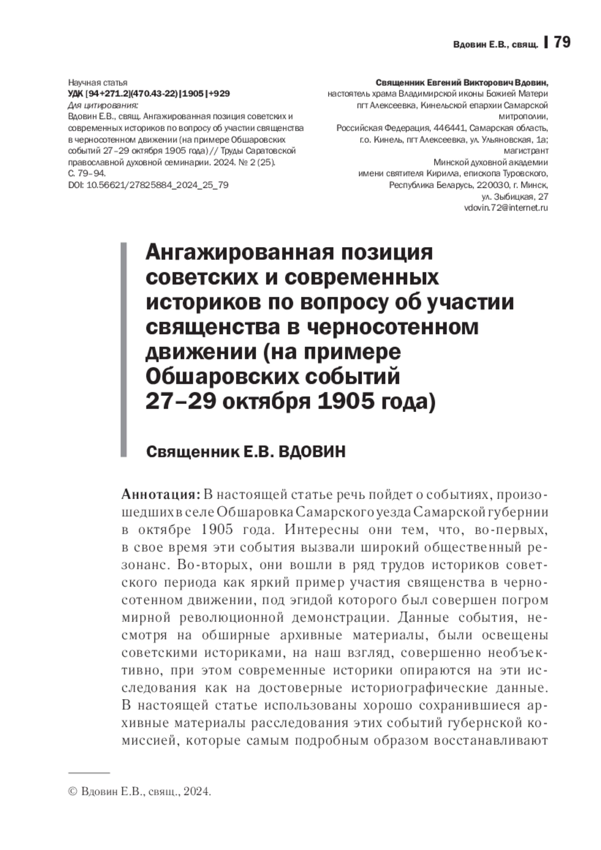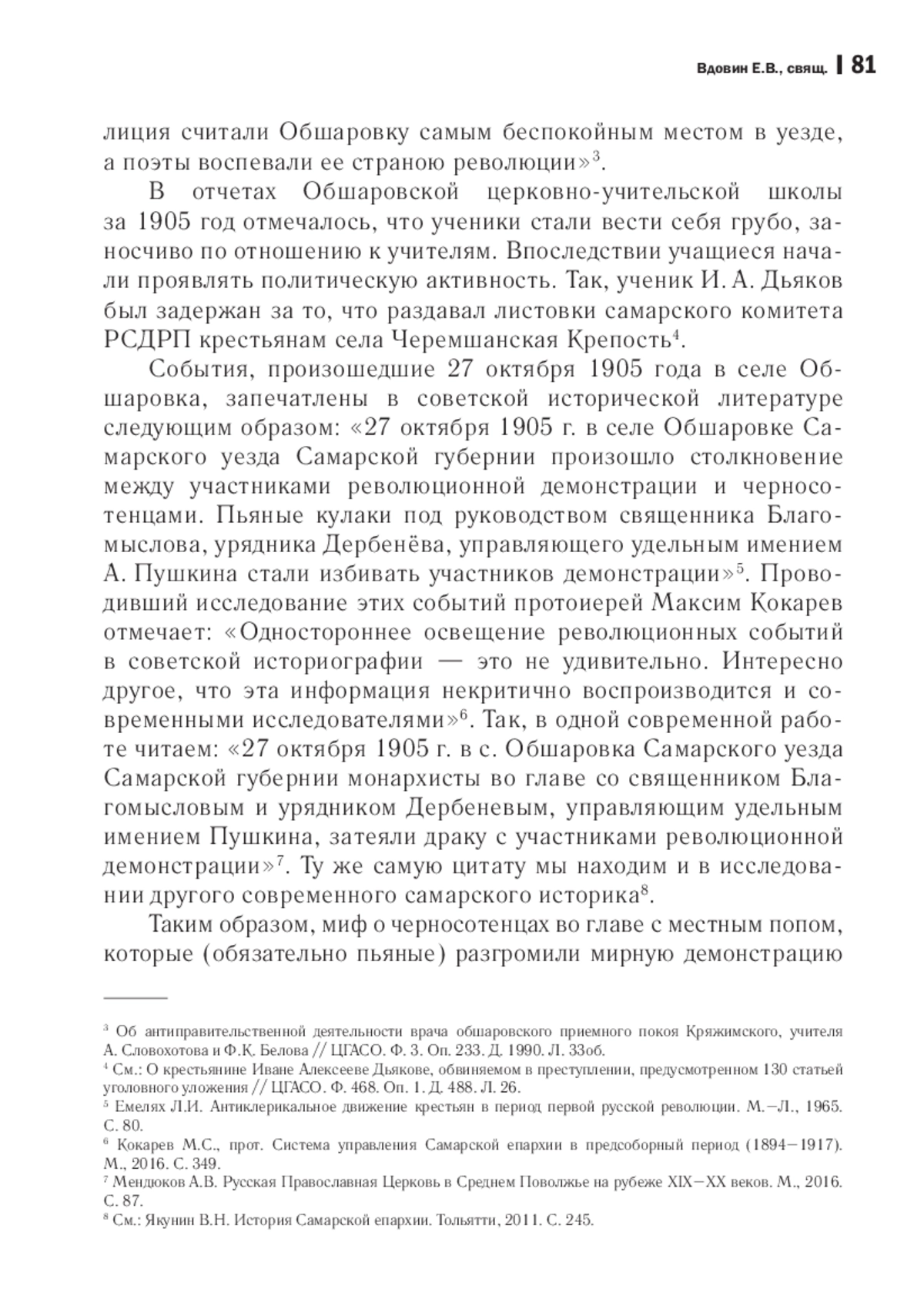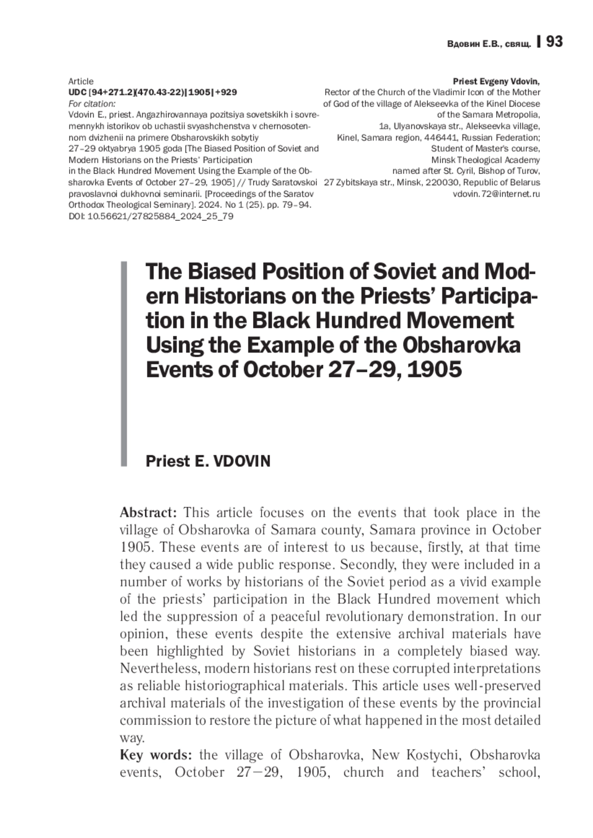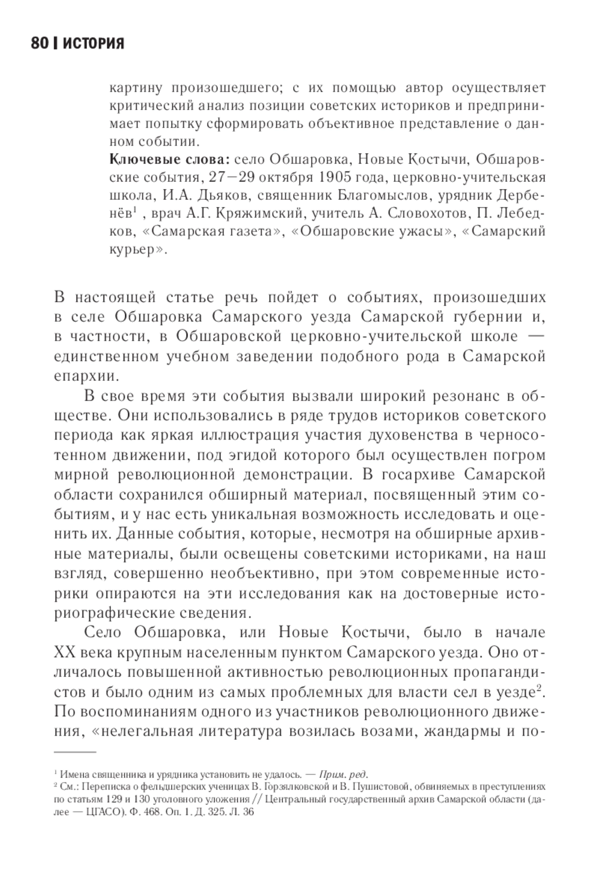 В настоящей статье речь пойдет о событиях, произошедших в селе Обшаровка Самарского уезда Самарской губернии в октябре 1905 года. Интересны они тем, что, во-первых, в свое время эти события вызвали широкий общественный резонанс. Во-вторых, они вошли в ряд трудов историков советского периода как яркий пример участия священства в черносотенном движении, под эгидой которого был совершен погром мирной революционной демонстрации. Данные события, несмотря на обширные архивные материалы, были освещены советскими историками, на наш взгляд, совершенно необъективно, при этом современные историки опираются на эти исследования как на достоверные историографические данные. В настоящей статье использованы хорошо сохранившиеся архивные материалы расследования этих событий губернской комиссией, которые самым подробным образом восстанавливают картину произошедшего; с их помощью автор осуществляет критический анализ позиции советских историков и предпринимает попытку сформировать объективное представление о данном событии.