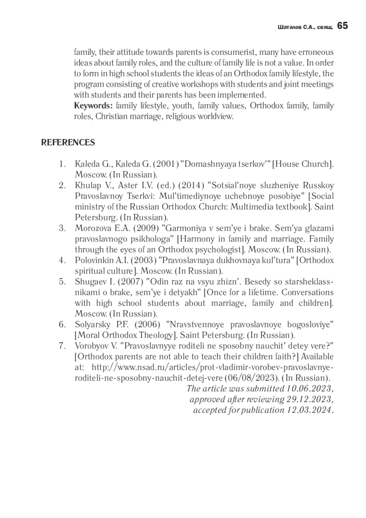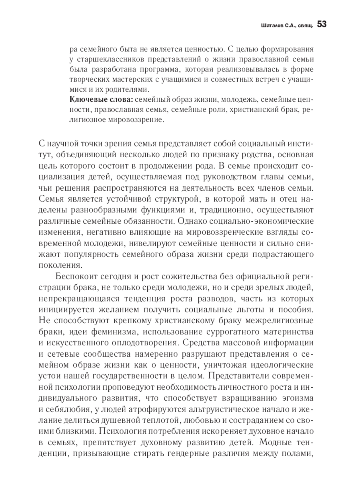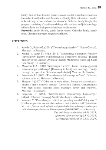 В статье раскрыты факторы, негативно влияющие на мировоззренческие взгляды современной молодежи, нивелирующие семейные ценности и значительно снижающие популярность семейного образа жизни среди подрастающего поколения, включая юношей и девушек, воспитывающихся в православных семьях, чьи родители не всегда могут самостоятельно привить детям свое христианское видение семьи, сформировать грамотные мировоззренческие оценки роли мужчины и женщины в семье. Дана оценка значимости семьи с позиции представителей Русской Православной Церкви, показано, что в контексте воспитательной миссии Русской Православной Церкви одним из направлений является усиление миссионерской направленности приходской жизни в сфере воспитания молодежи. Восполнить утрату представлений о семейном образе жизни среди юношества можно путем развития у них христианского мировоззрения и формирования представлений о семейных ценностях в соответствии с христианскими заповедями. При этом значение приобретают осуществляемые приходами программы воспитательной работы среди молодежи. На основании проведенного исследования семейных ценностей среди учащихся старших классов выявлено, что многие учащиеся не могут назвать способы проявления любви в семье, их отношение к родителям - потребительское, у многих - ошибочные представления о семейных ролях, а культура семейного быта не является ценностью. С целью формирования у старшеклассников представлений о жизни православной семьи была разработана программа, которая реализовывалась в форме творческих мастерских с учащимися и совместных встреч с учащимися и их родителями.