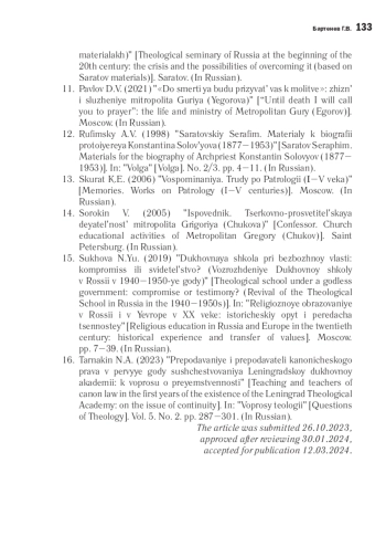 41. Тарнакин Н. А. Преподавание и преподаватели канонического права в первые годы существования Ленинградской духовной академии: к вопросу о преемственности // Вопросы теологии. 2023. Т. 5. № 2. С. 287-301. EDN: AKQXFS