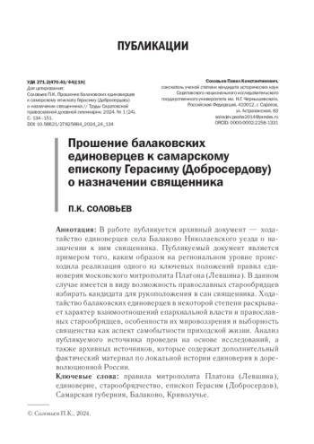В работе публикуется архивный документ - ходатайство единоверцев села Балаково Николаевского уезда о назначении к ним священника. Публикуемый документ является примером того, каким образом на региональном уровне происходила реализация одного из ключевых положений правил единоверия московского митрополита Платона (Левшина). В данном случае имеется в виду возможность православных старообрядцев избирать кандидата для рукоположения в сан священника. Ходатайство балаковских единоверцев в некоторой степени раскрывает характер взаимоотношений епархиальной власти и православных старообрядцев, особенности их мировоззрения и выборность священства как аспект самобытности приходской жизни. Анализ публикуемого источника проведен на основе исследований, а также архивных источников, которые содержат дополнительный фактический материал по локальной истории единоверия в дореволюционной России.