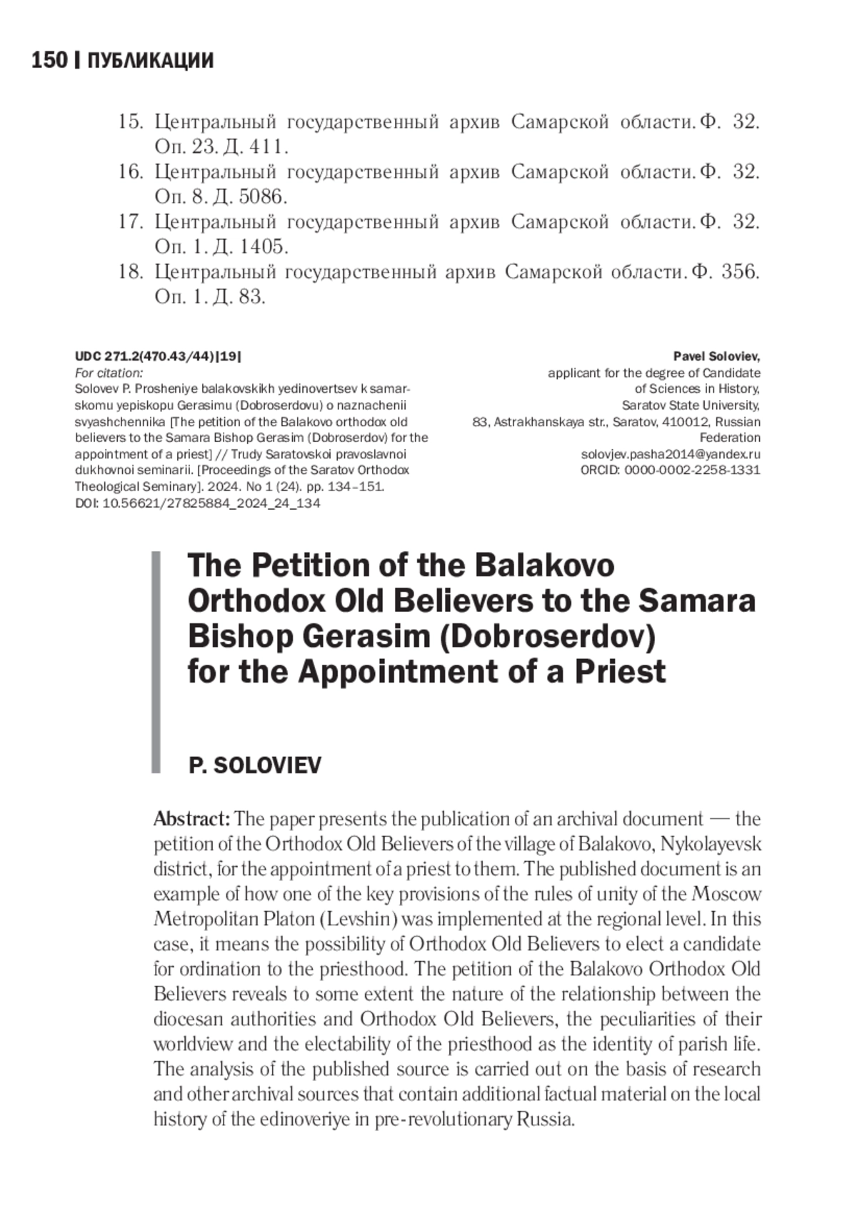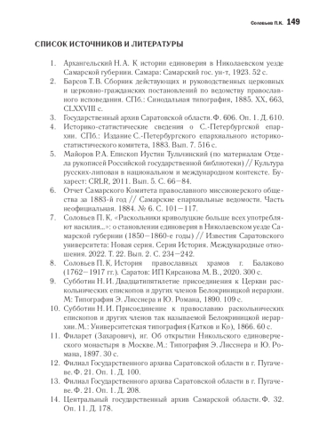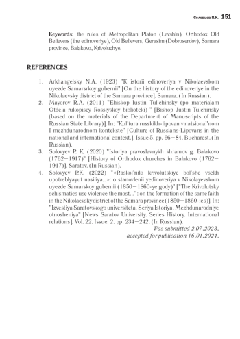 7. Соловьев П. К. “Раскольники криволуцкие больше всех употребляют насилия…”: о становлении единоверия в Николаевском уезде Самарской губернии (1850-1860-е годы) // Известия Саратовского университета: Новая серия. Серия История. Международные отношения. 2022. Т. 22. Вып. 2. С. 234-242. EDN: SMSLYW