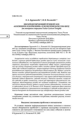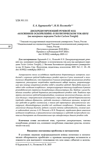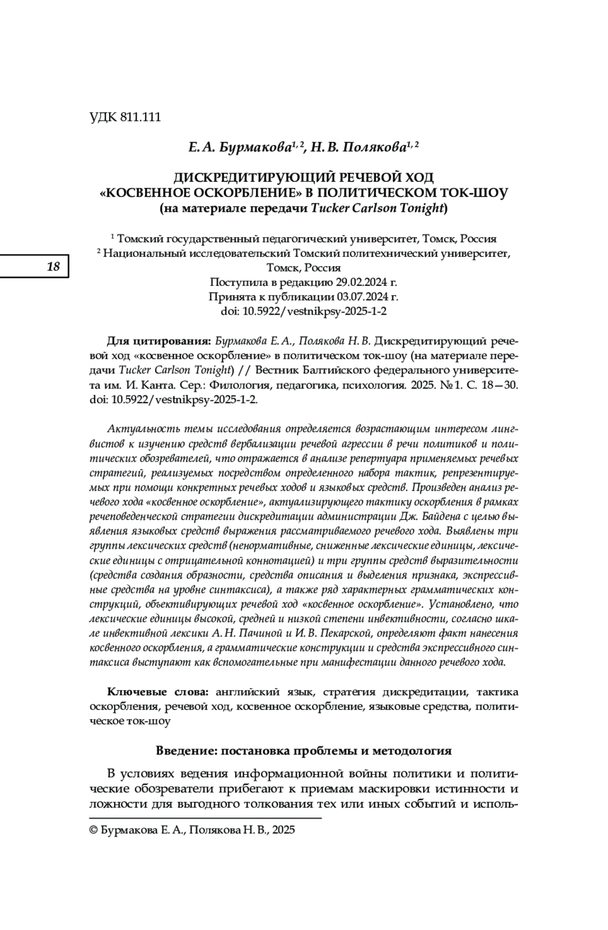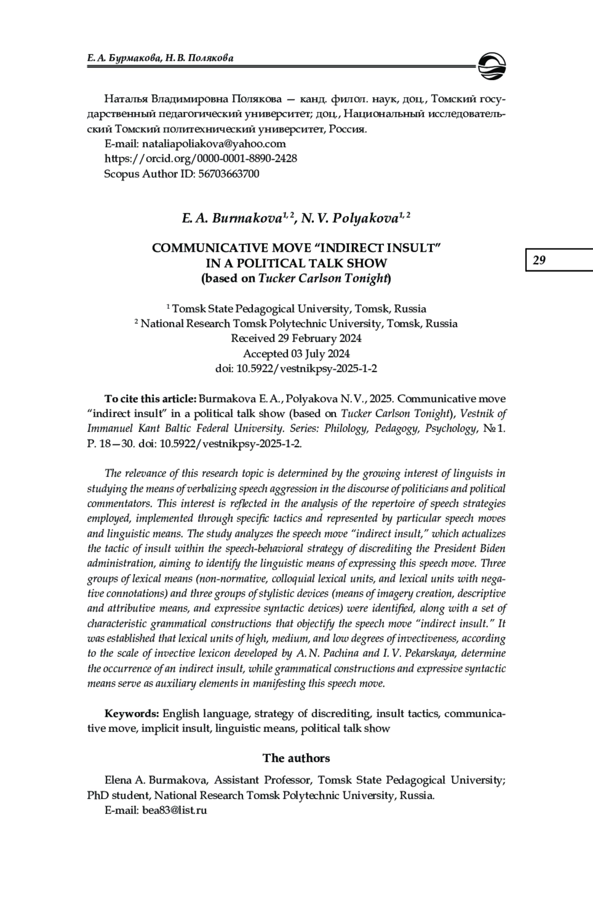 4. Бурмакова Е. А., Полякова Н. В. Комбинированные тактики, реализующие речеповеденческую стратегию дискредитации администрации Д. Байдена: на материале передачи Tucker Carlson Tonight // СибСкрипт. 2024. № 26 (1). С. 62-71. EDN: IDKIYJ