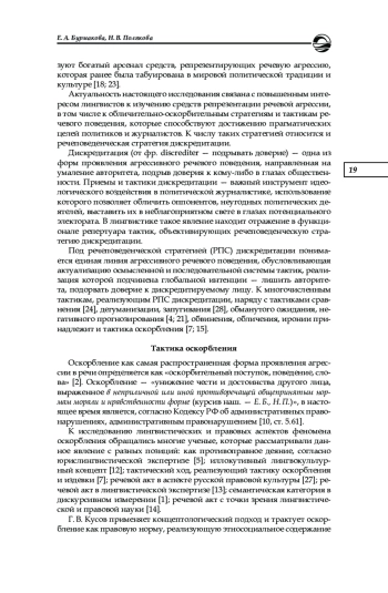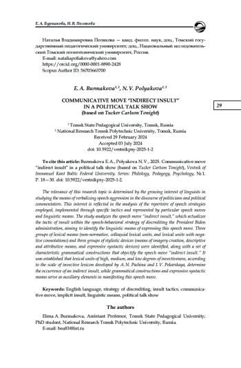 Актуальность темы исследования определяется возрастающим интересом линг вистов к изучению средств вербализации речевой агрессии в речи политиков и поли тических обозревателей, что отражается в анализе репертуара применяемых речевых стратегий, реализуемых посредством определенного набора тактик, репрезентируемых при помощи конкретных речевых ходов и языковых средств. Произведен анализ ре чевого хода «косвенное оскорбление», актуализирующего тактику оскорбления в рамках речеповеденческой стратегии дискредитации администрации Дж. Байдена с целью вы явления языковых средств выражения рассматриваемого речевого хода. Выявлены три группы лексических средств (ненормативные, сниженные лексические единицы, лексические единицы с отрицательной коннотацией) и три группы средств выразительности (средства создания образности, средства описания и выделения признака, экспрессив ные средства на уровне синтаксиса), а также ряд характерных грамматических кон струкций, объективирующих речевой ход «косвенное оскорбление». Установлено, что лексические единицы высокой, средней и низкой степени инвективности, согласно шка ле инвективной лексики А. Н. Пачиной и И. В. Пекарской, определяют факт нанесения косвенного оскорбления, а грамматические конструкции и средства экспрессивного син таксиса выступают как вспомогательные при манифестации данного речевого хода