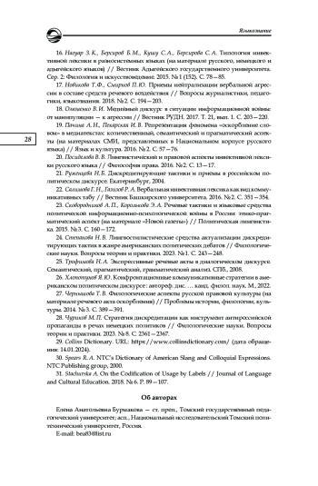 23. Сковородников А. П., Королькова Э. А. Речевые тактики и языковые средства политической информационно-психологической войны в России: этико-прагматический аспект (на материале “Новой газеты”) // Политическая лингвистика. 2015. № 3. С. 160-172. EDN: UNFGYL