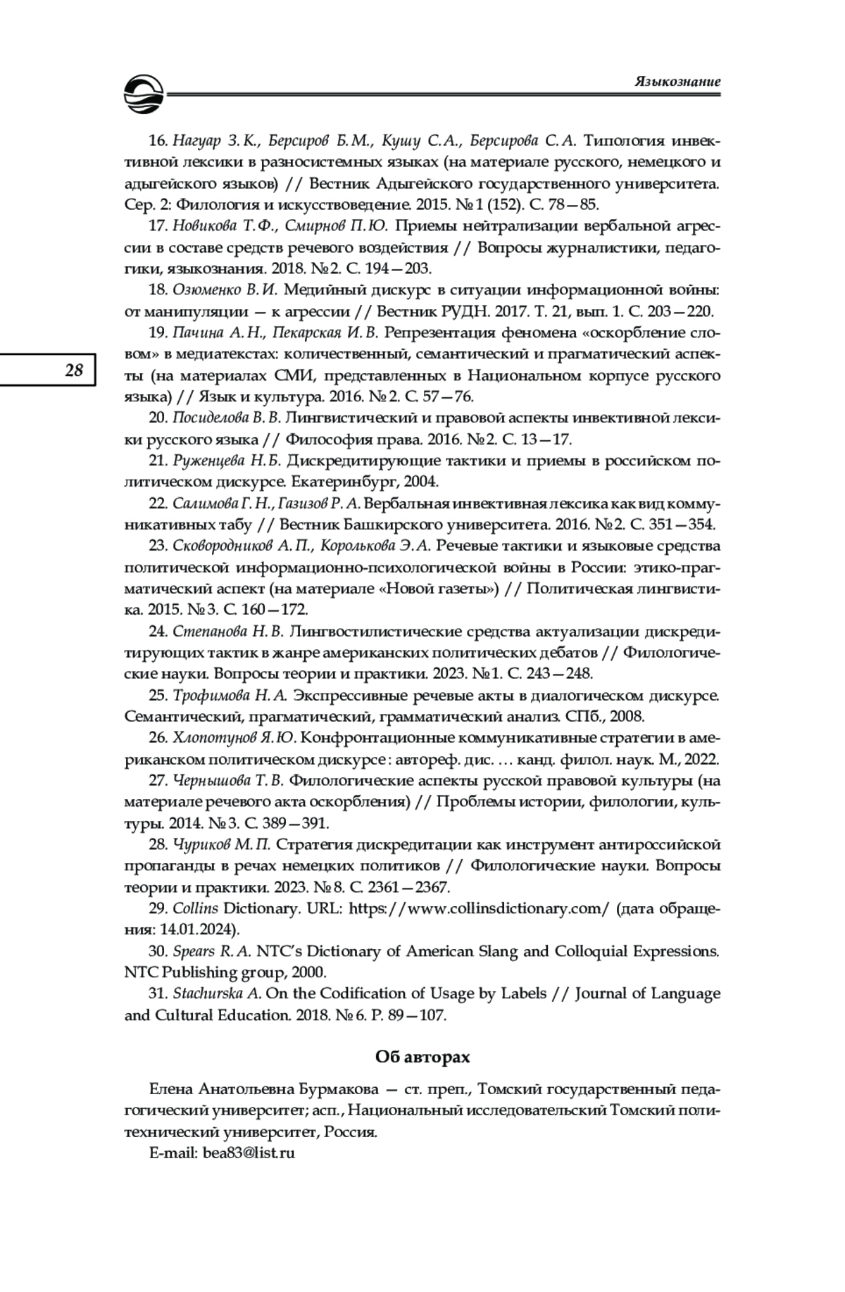 28. Чуриков М. П. Стратегия дискредитации как инструмент антироссийской пропаганды в речах немецких политиков // Филологические науки. Вопросы теории и практики. 2023. № 8. С. 2361-2367. EDN: JNHRCK