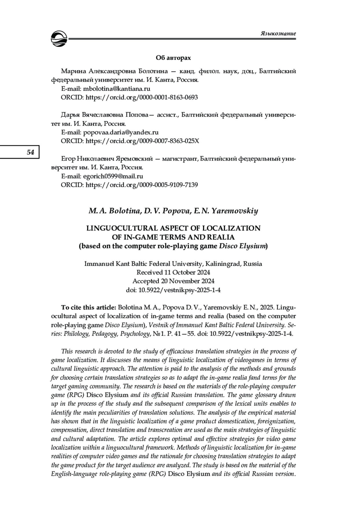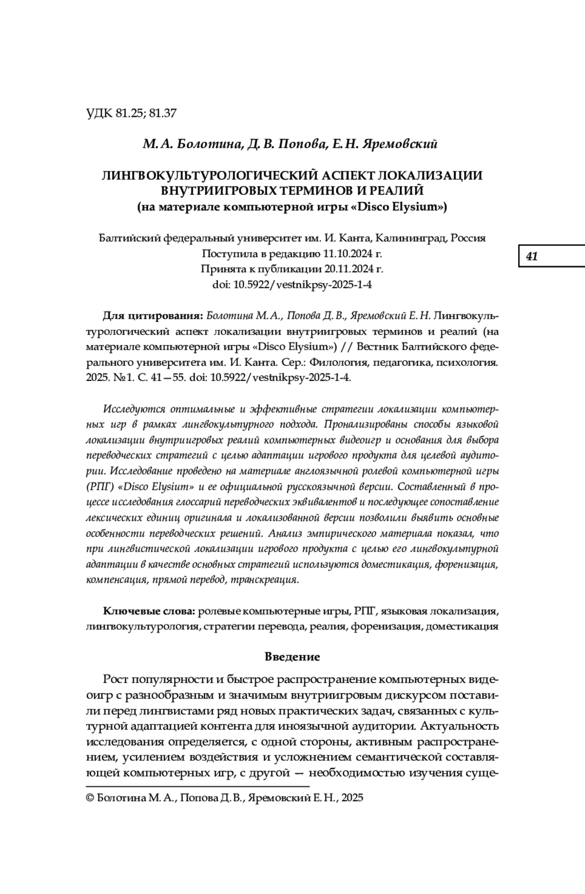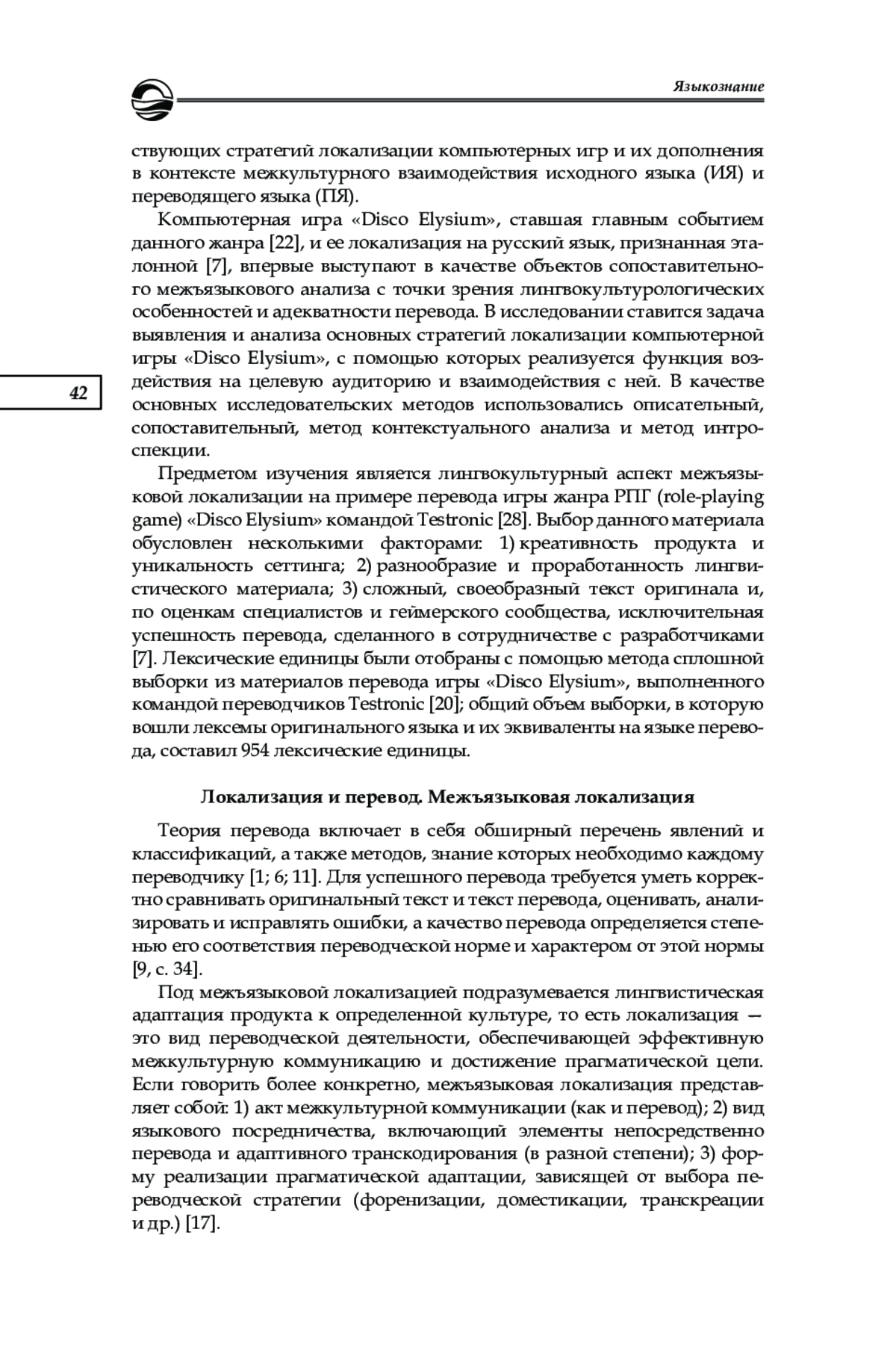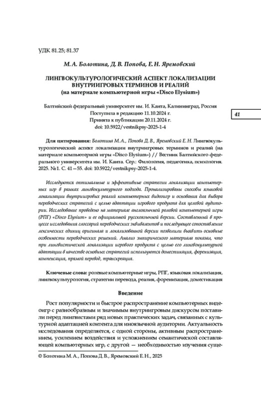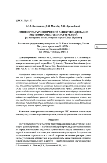 Исследуются оптимальные и эффективные стратегии локализации компьютер ных игр в рамках лингвокультурного подхода. Пронализированы способы языковой локализации внутриигровых реалий компьютерных видеоигр и основания для выбора переводческих стратегий с целью адаптации игрового продукта для целевой аудито рии. Исследование проведено на материале англоязычной ролевой компьютерной игры (РПГ) «Disco Elysium» и ее официальной русскоязычной версии. Составленный в про цессе исследования глоссарий переводческих эквивалентов и последующее сопоставление лексических единиц оригинала и локализованной версии позволили выявить основные особенности переводческих решений. Анализ эмпирического материала показал, что при лингвистической локализации игрового продукта с целью его лингвокультурной адаптации в качестве основных стратегий используются доместикация, форенизация, компенсация, прямой перевод, транскреация