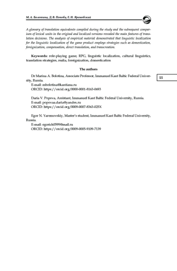 3. Болотина М. А., Смирнова А. А. Перевод безэквивалентной лексики при локализации компьютерных игр // Вестник Балтийского федерального университета им. И. Канта. Сер.: Филология, педагогика, психология. 2018. № 1. С. 20-28. EDN: YSXKTT