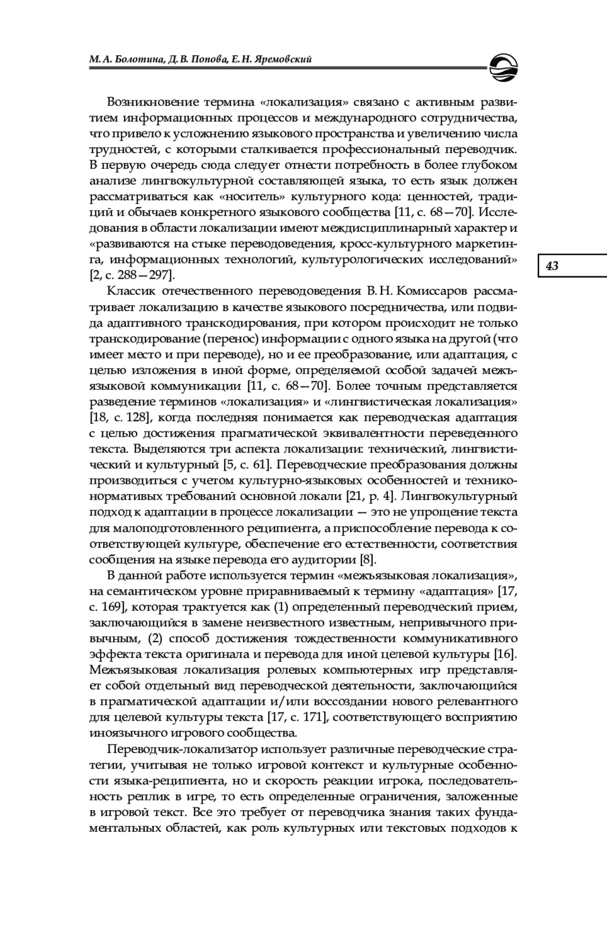 17. Чистова Е. В. Теоретический статус межъязыковой локализации как особого вида переводческой деятельности // Культура и текст. 2020. № 3 (42). С. 161- 175. EDN: QEHPOP