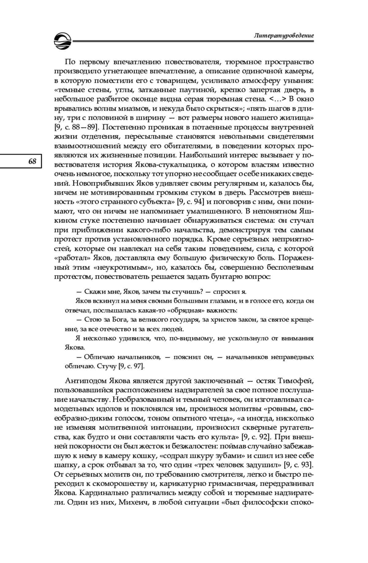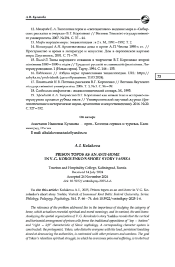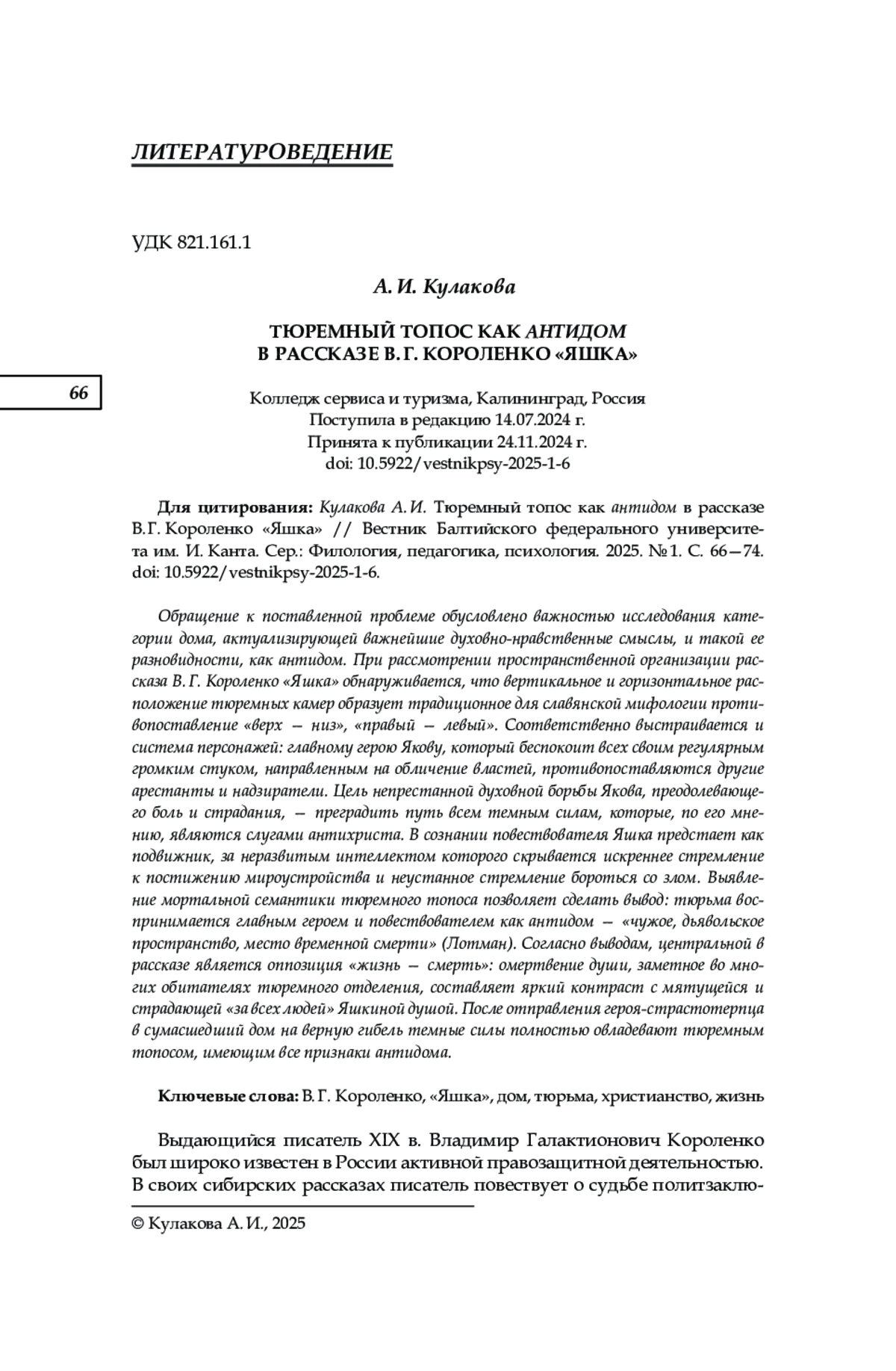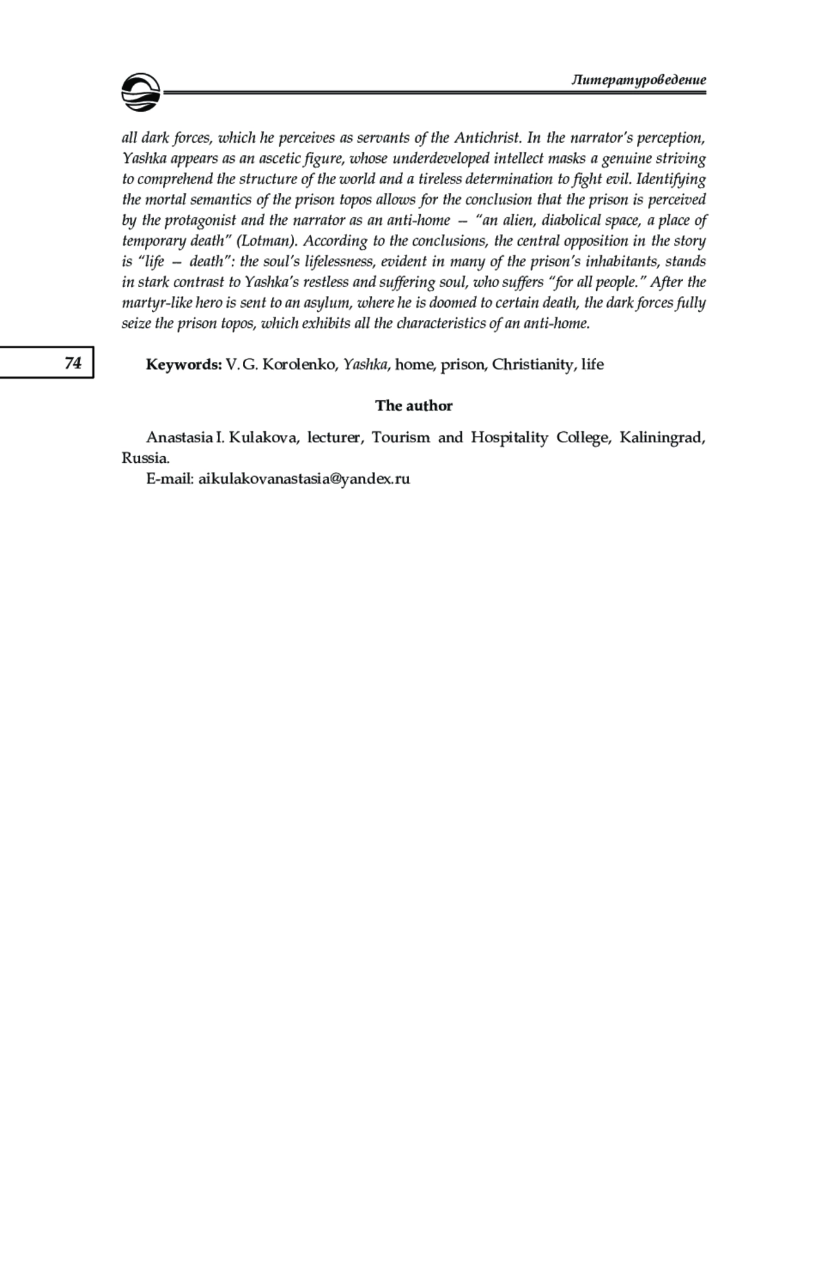 Обращение к поставленной проблеме обусловлено важностью исследования кате гории дома, актуализирующей важнейшие духовнонравственные смыслы, и такой ее разновидности, как антидом. При рассмотрении пространственной организации рас сказа В. Г. Короленко «Яшка» обнаруживается, что вертикальное и горизонтальное рас положение тюремных камер образует традиционное для славянской мифологии противопоставление «верх — низ», «правый — левый». Соответственно выстраивается и система персонажей: главному герою Якову, который беспокоит всех своим регулярным громким стуком, направленным на обличение властей, противопоставляются другие арестанты и надзиратели. Цель непрестанной духовной борьбы Якова, преодолевающе го боль и страдания, — преградить путь всем темным силам, которые, по его мне нию, являются слугами антихриста. В сознании повествователя Яшка предстает как подвижник, за неразвитым интеллектом которого скрывается искреннее стремление к постижению мироустройства и неустанное стремление бороться со злом. Выявление мортальной семантики тюремного топоса позволяет сделать вывод: тюрьма вос принимается главным героем и повествователем как антидом — «чужое, дьявольское пространство, место временной смерти» (Лотман). Согласно выводам, центральной в рассказе является оппозиция «жизнь — смерть»: омертвение души, заметное вомногих обитателях тюремного отделения, составляет яркий контраст с мятущейся и страдающей «за всех людей» Яшкиной душой. После отправления героястрастотерпца в сумасшедший дом на верную гибель темные силы полностью овладевают тюремным топосом, имеющим все признаки антидома.