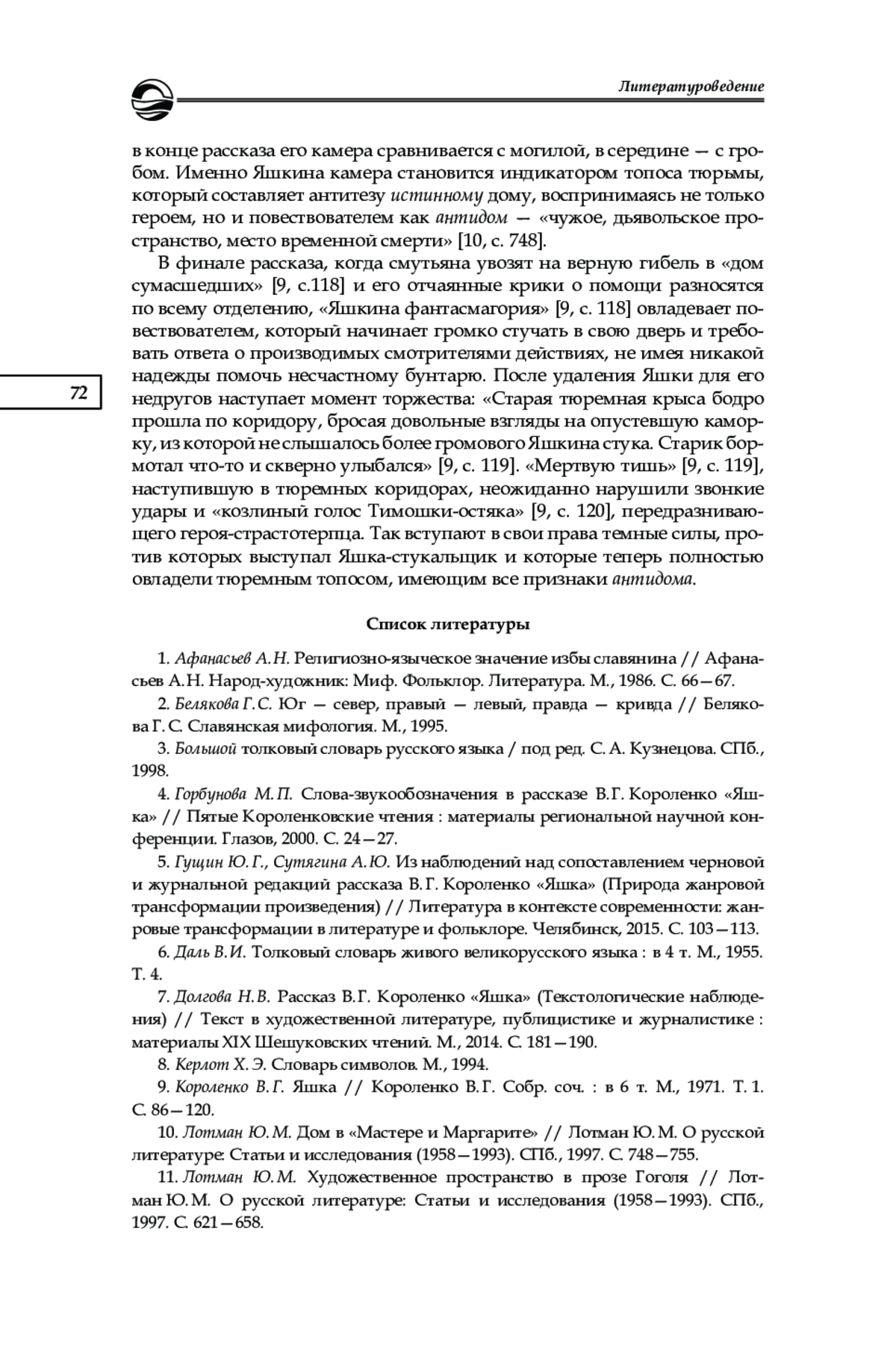 5. Гущин Ю. Г., Сутягина А. Ю. Из наблюдений над сопоставлением черновой и журнальной редакций рассказа В. Г. Короленко “Яшка” (Природа жанровой трансформации произведения) // Литература в контексте современности: жанровые трансформации в литературе и фольклоре. Челябинск, 2015. С. 103-113. EDN: VXCPNZ