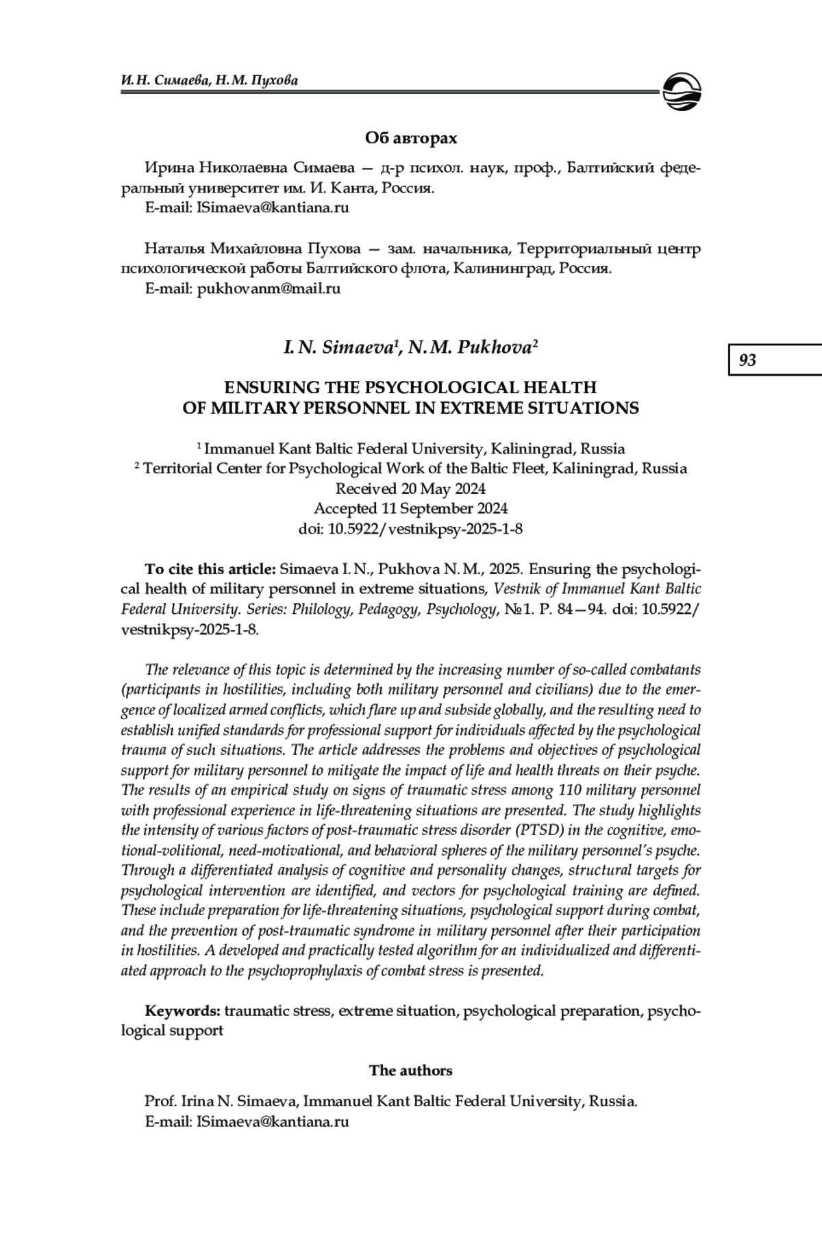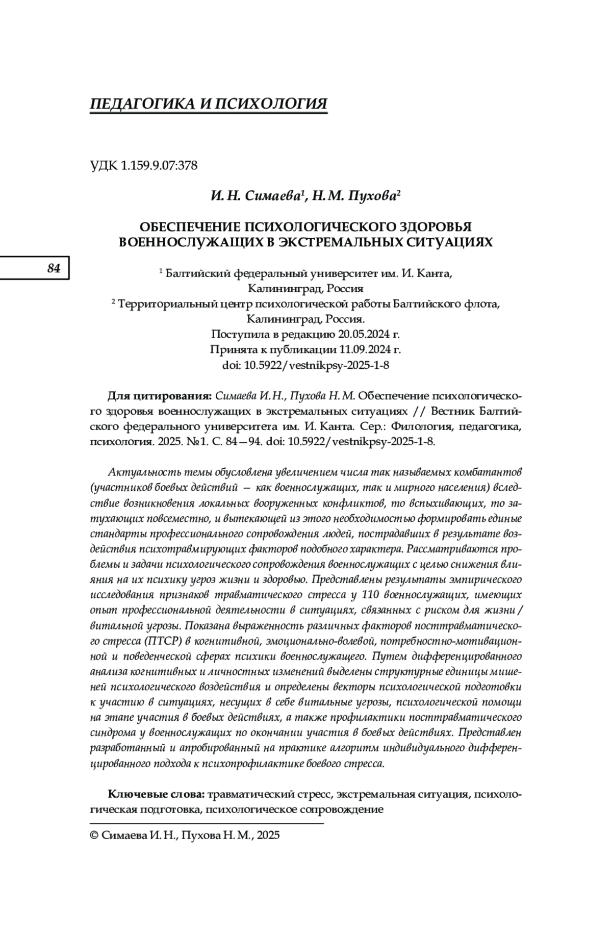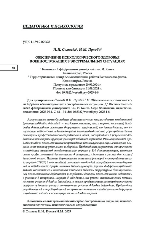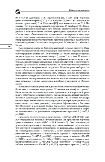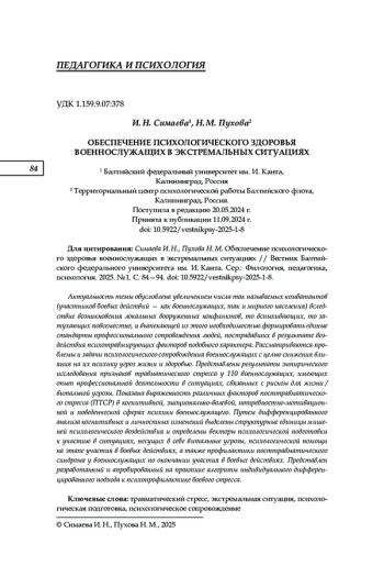 Актуальность темы обусловлена увеличением числа так называемых комбатантов (участников боевых действий — как военнослужащих, так и мирного населения) вслед ствие возникновения локальных вооруженных конфликтов, то вспыхивающих, то затухающих повсеместно, и вытекающей из этого необходимостью формировать единые стандарты профессионального сопровождения людей, пострадавших в результате воз действия психотравмирующих факторов подобного характера. Рассматриваются про блемы и задачи психологического сопровождения военнослужащих с целью снижения вли яния на их психику угроз жизни и здоровью. Представлены результаты эмпирического исследования признаков травматического стресса у 110 военнослужащих, имеющих опыт профессиональной деятельности в ситуациях, связанных с риском для жизни / витальной угрозы. Показана выраженность различных факторов посттравматическо го стресса (ПТСР) в когнитивной, эмоциональноволевой, потребностномотивацион ной и поведенческой сферах психики военнослужащего. Путем дифференцированного анализа когнитивных и личностных изменений выделены структурные единицы мише ней психологического воздействия и определены векторы психологической подготовки к участию в ситуациях, несущих в себе витальные угрозы, психологической помощи на этапе участия в боевых действиях, а также профилактики посттравматического синдрома у военнослужащих по окончании участия в боевых действиях. Представлен разработанный и апробированный на практике алгоритм индивидуального дифференцированного подхода к психопрофилактике боевого стресса.