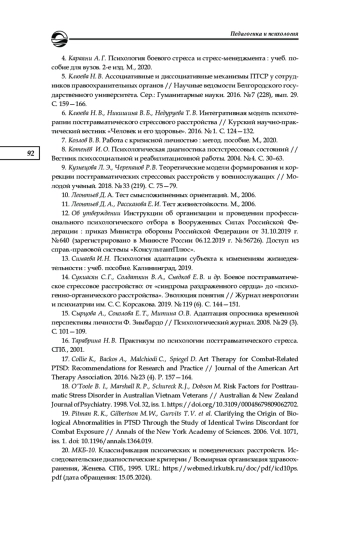 9. Кузнецова Л. Э., Черепанов Р. В. Теоретические модели формирования и коррекции посттравматических стрессовых расстройств у военнослужащих // Молодой ученый. 2018. № 33 (219). С. 75-79. EDN: XWETCP