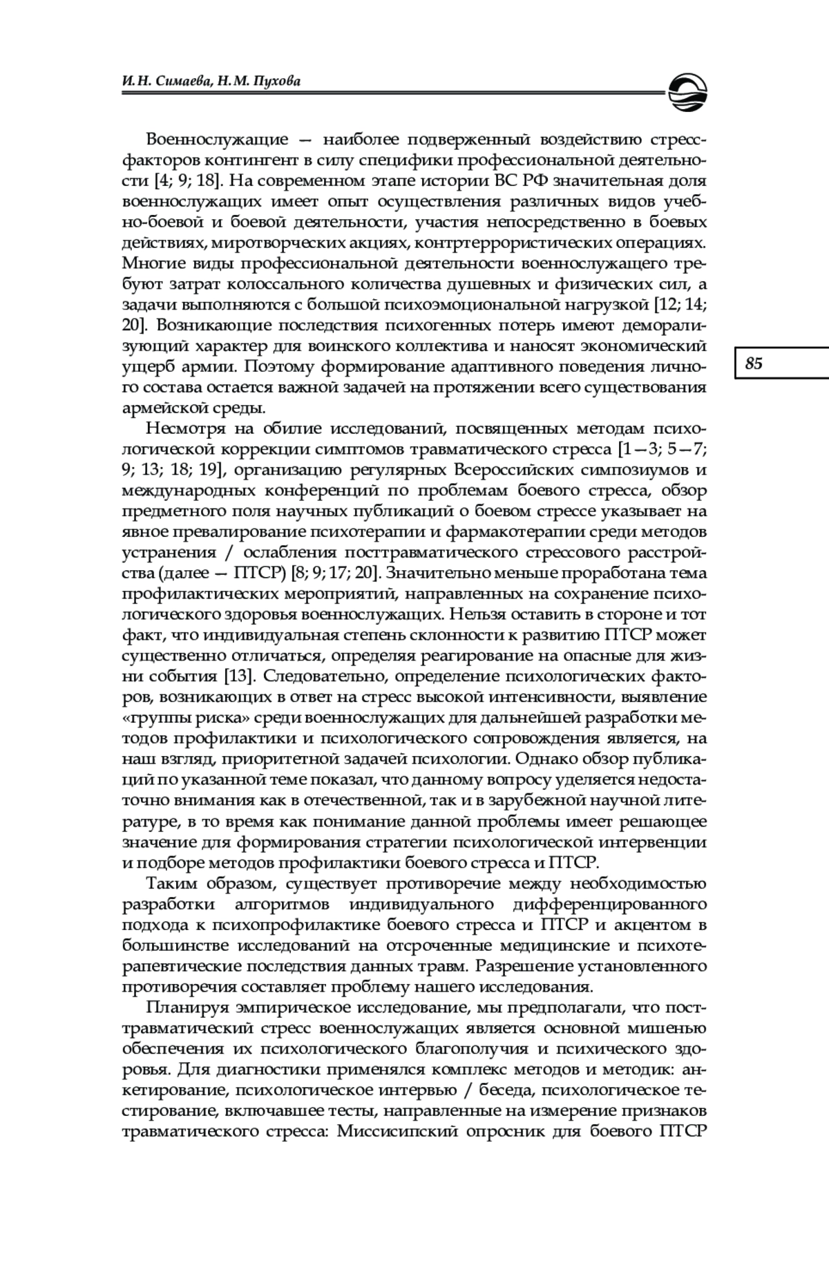 Военнослужащие — наиболее подверженный воздействию стрессфакторов контингент в силу специфики профессиональной деятельности [4; 9; 18]. На современном этапе истории ВС РФ значительная доля военнослужащих имеет опыт осуществления различных видов учебно-боевой и боевой деятельности, участия непосредственно в боевых действиях, миротворческих акциях, контртеррористических операциях. Многие виды профессиональной деятельности военнослужащего требуют затрат колоссального количества душевных и физических сил, а задачи выполняются с большой психоэмоциональной нагрузкой [12; 14; 20]. Возникающие последствия психогенных потерь имеют деморализующий характер для воинского коллектива и наносят экономический ущерб армии. Поэтому формирование адаптивного поведения личного состава остается важной задачей на протяжении всего существования армейской среды