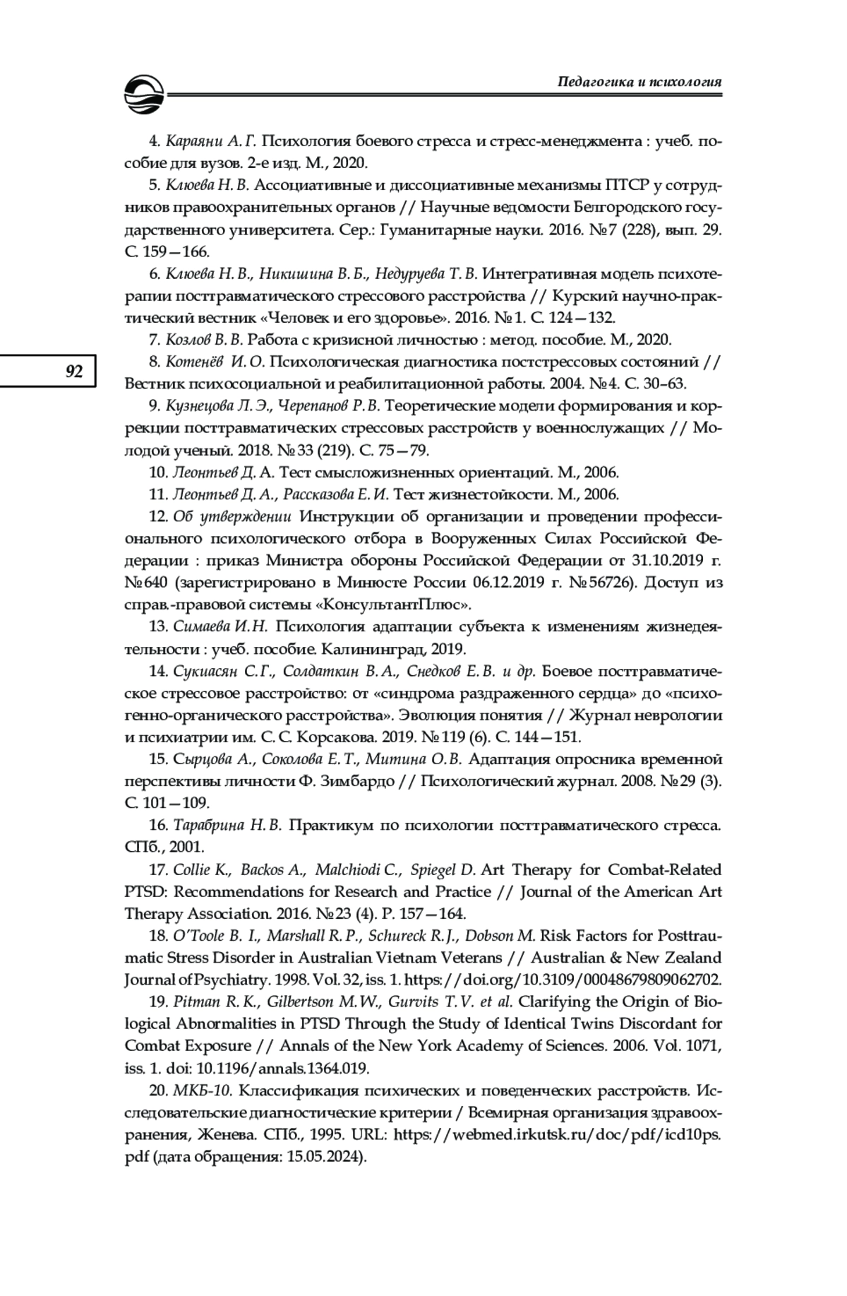 5. Клюева Н. В. Ассоциативные и диссоциативные механизмы ПТСР у сотрудников правоохранительных органов // Научные ведомости Белгородского государственного университета. Сер.: Гуманитарные науки. 2016. № 7 (228), вып. 29. С. 159-166. EDN: VTPMCP